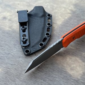 Prezentowany model, o stanie magazynowym (“fabrycznie nowy”) wykonany został w 2016 (!) roku i jest z pewnością rzadkością. Jest to egzemplarz wykonany ze stali Elmax, z okładkami rękojeści z pomarańczowego kompozytu G10 skręconymi śrubami ze stali nierdzewnej. W zestawie znajduje się kabura Kydex.