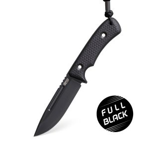 a blade made of premium Elmax steel, with innovating hollow grind (characteristic grooves on the blade) and fuller. Handle scales are made of Black Paper Micarta with olive liners. The knife has an