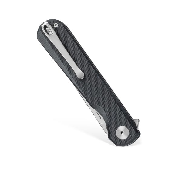- Rękojeść: stalowe linersy, okładki z czarnego G10, stalowy klips mocujący (przekładalny, Tip-Up)