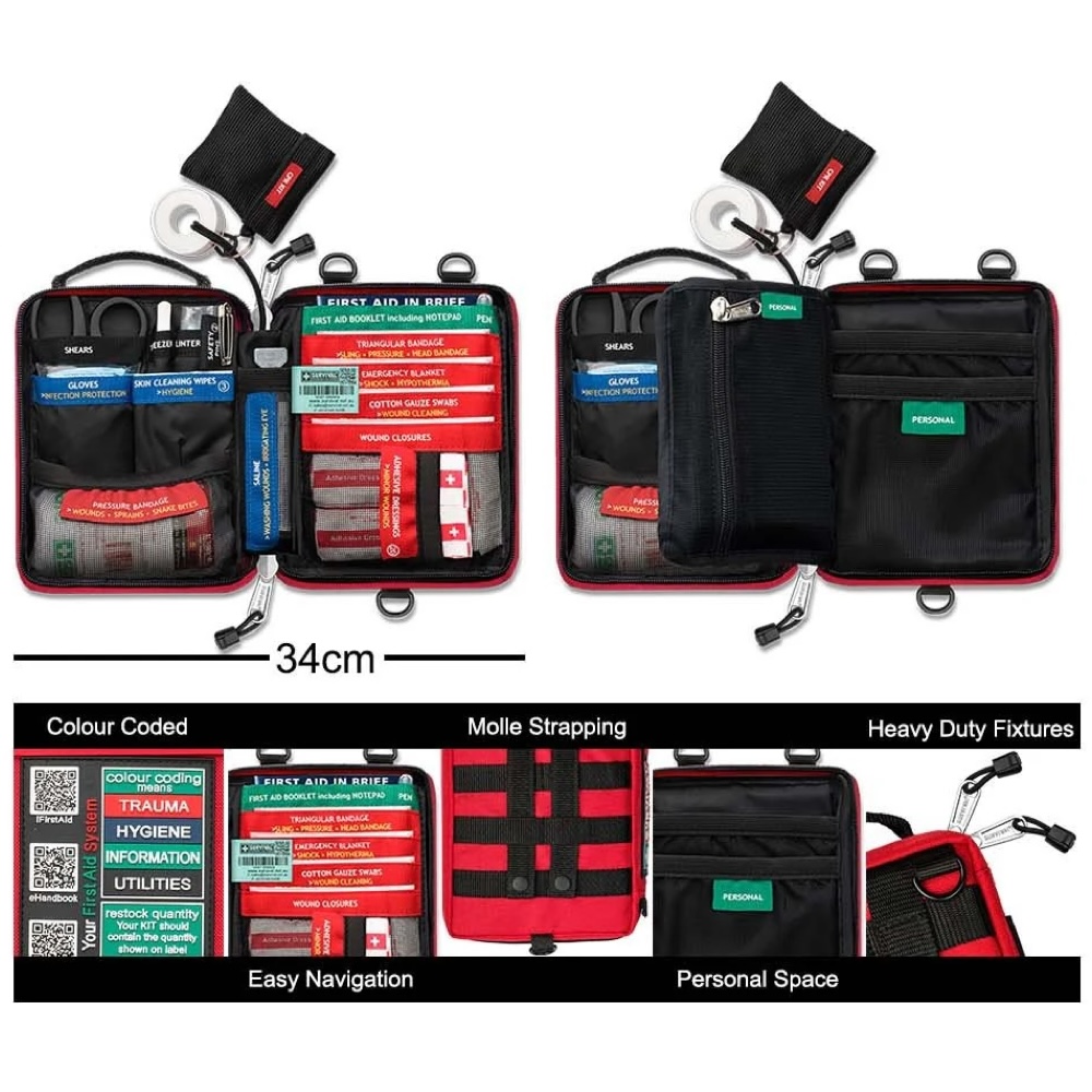 Zastosowany system Colour Coding (Kolorystyczne Oznaczenia Wnętrza) pozwala na szybką identyfikację poszczególnych elementów wyposażenia, co ułatwia działanie w sytuacjach stresowych i skraca czas reakcji. Wygodny uchwyt transportowy umożliwia natychmiastowe sięgnięcie po apteczkę w razie potrzeby.