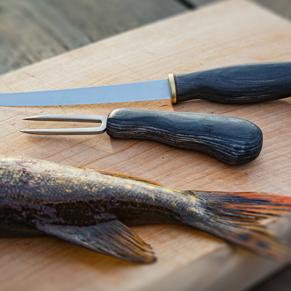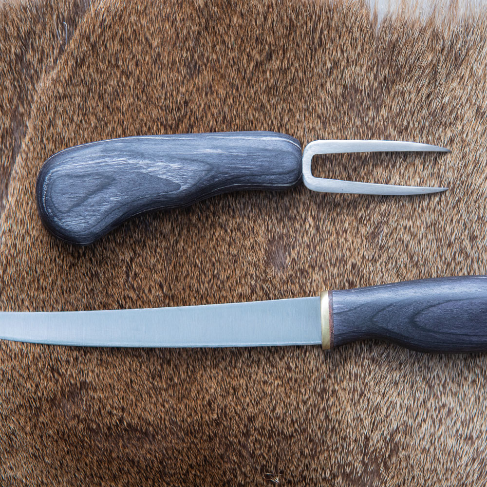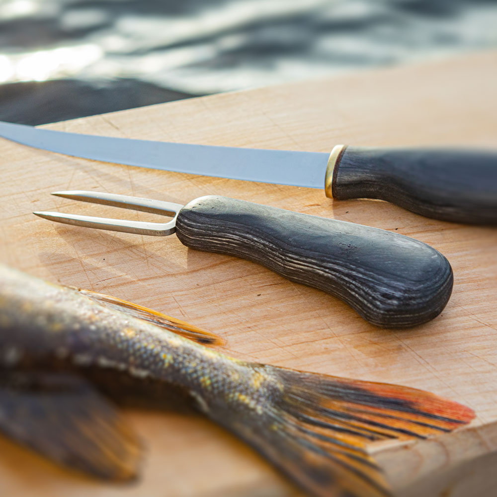 Widelec do filetowania ryb Arctic Legend Fish Spike Czerniona Brzoza Karelska to ręcznie wykonany „widelec” bardzo przydatny do przytrzymywania filetowanej ryby, obracania i krojenia mięsa lub jako biwakowy widelec. Kolce wykonane są z wysokogatunkowej stali nierdzewnej dla właściwej higieny pracy. Fish Spike w połączeniu z nożem serii Fillet Knife w tej samej tonacji kolorystycznej, tworzą wspaniały zestaw kuchni polowej.
