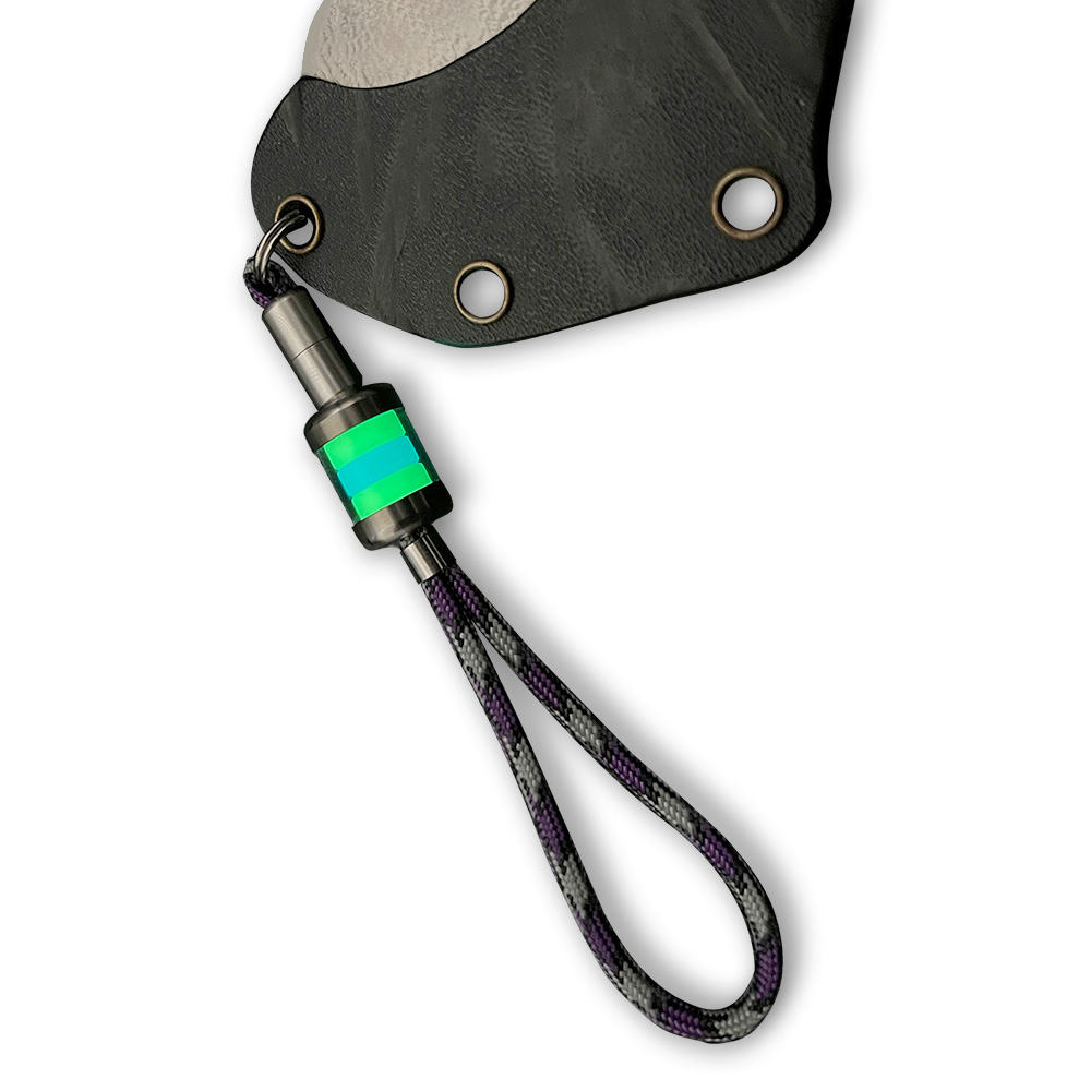 Prezentowana wersja posiada wypełnienie świecące na zielono-błękitno-zielono oraz odpowiednio dobrany kolorystycznie, paracord oraz kółko, które pozwala na szybkie zamontowanie w preferowanym miejscu.