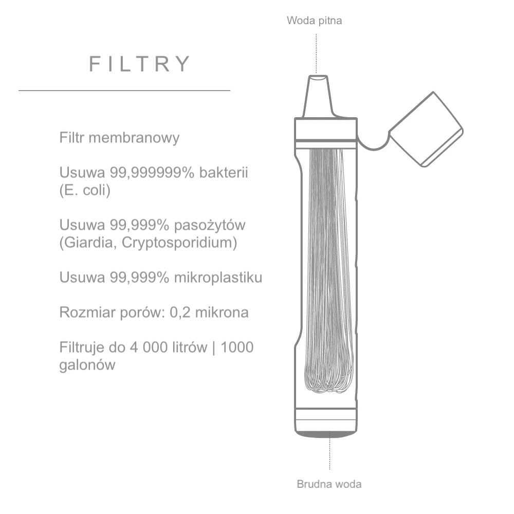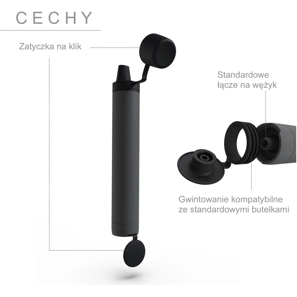 **UNIWERSALNY**: Świetny podczas wędrówek, biwakowania, podróży czy w sytuacjach awaryjnych. Pozwala na picie wody bezpośrednio z jeziora, rzeki czy strumyka. Dzięki standardowemu gwintowi 28 mm jest również kompatybilny z większością popularnych butelek na wodę.