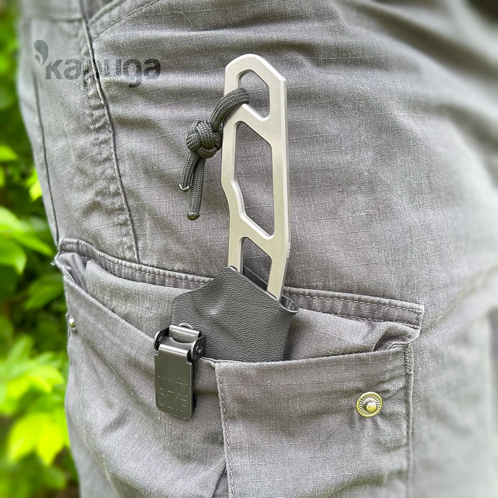 Klips super , idealny w moim przypadku do fixeda w kydeksie (około200mm, „ostrego” 90 mm) noszonego IWB. Trzyma mocno , łatwy w montażu i demontażu,wysoka jakość wykonania na najwyższym poziomie. Praktycznie niewyczuwalny, nie uwiera, nie zawadza itd.