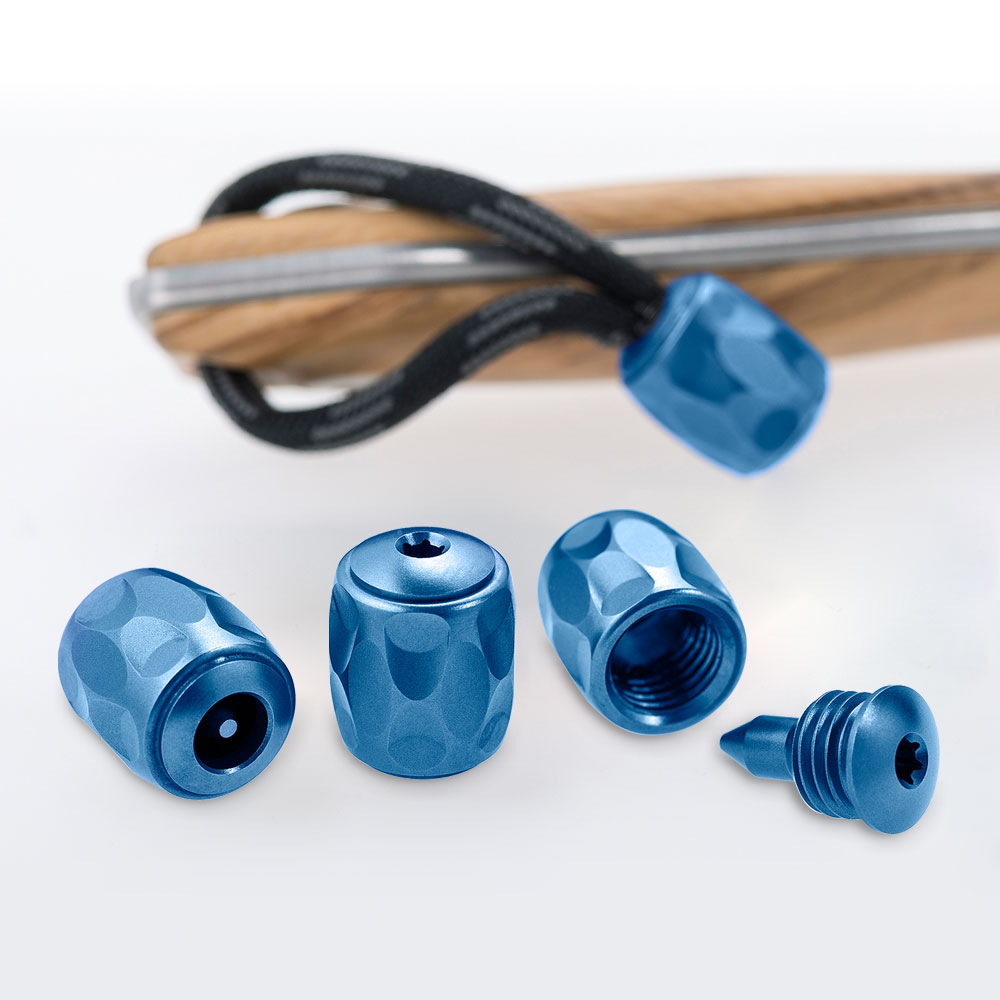 TIP (Small Titanium Pearl) wykonany został z anodyzowanego na niebiesko tytanu i składa się z dwóch części. Śruba z rozpierakiem pozwala na zablokowanie i ukrycie paracordu wewnątrz koralika i tworzy estetyczne zakończenie noża, latarki czy breloka. Zawieszony na nożu czy latarce pomoże w wyjęciu noża z kieszeni lub pochwy albo przedłużając chwyt małej latarki.