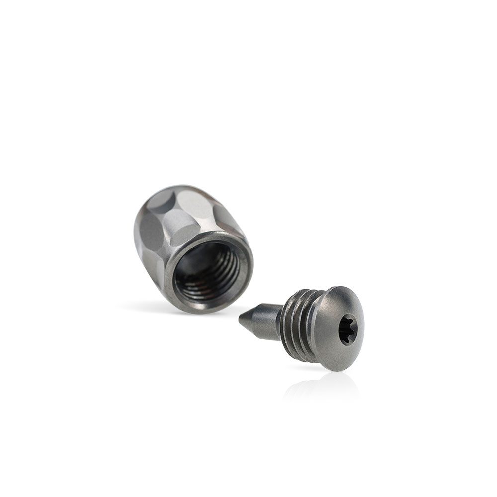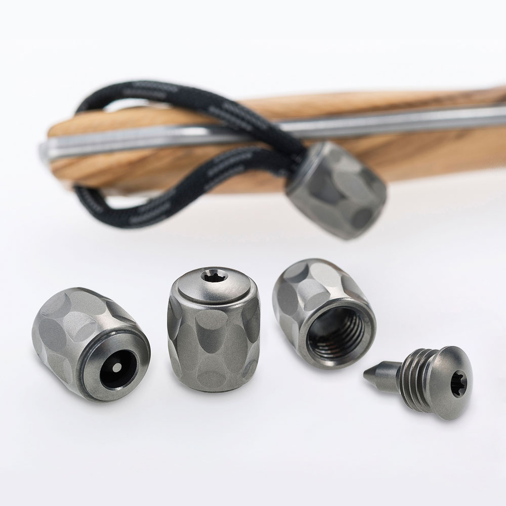 TIP (Small Titanium Pearl) wykonany został z anodyzowanego na szaro tytanu i składa się z dwóch części. Śruba z rozpierakiem pozwala na zablokowanie i ukrycie paracordu wewnątrz koralika i tworzy estetyczne zakończenie noża, latarki czy breloka. Zawieszony na nożu czy latarce pomoże w wyjęciu noża z kieszeni lub pochwy albo przedłużając chwyt małej latarki.