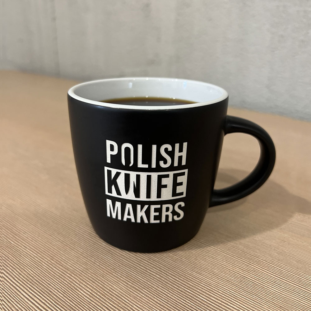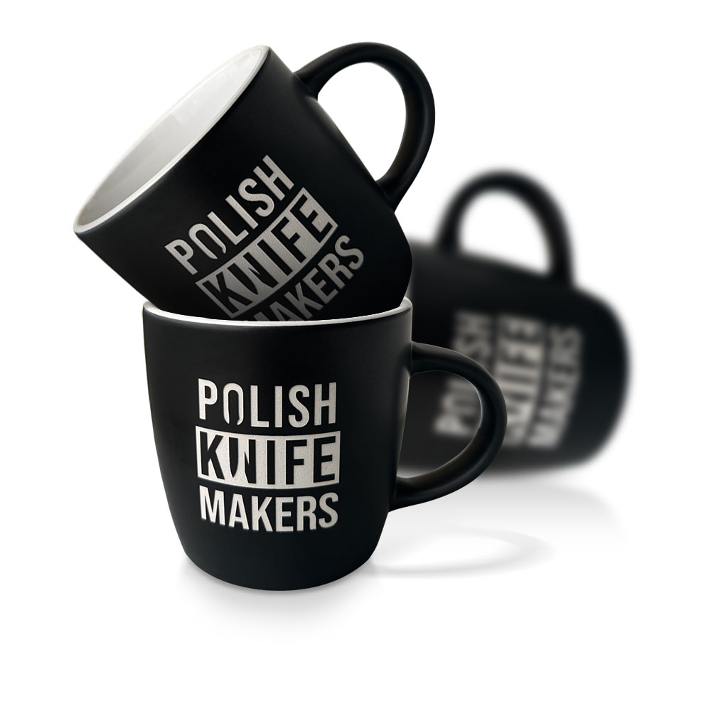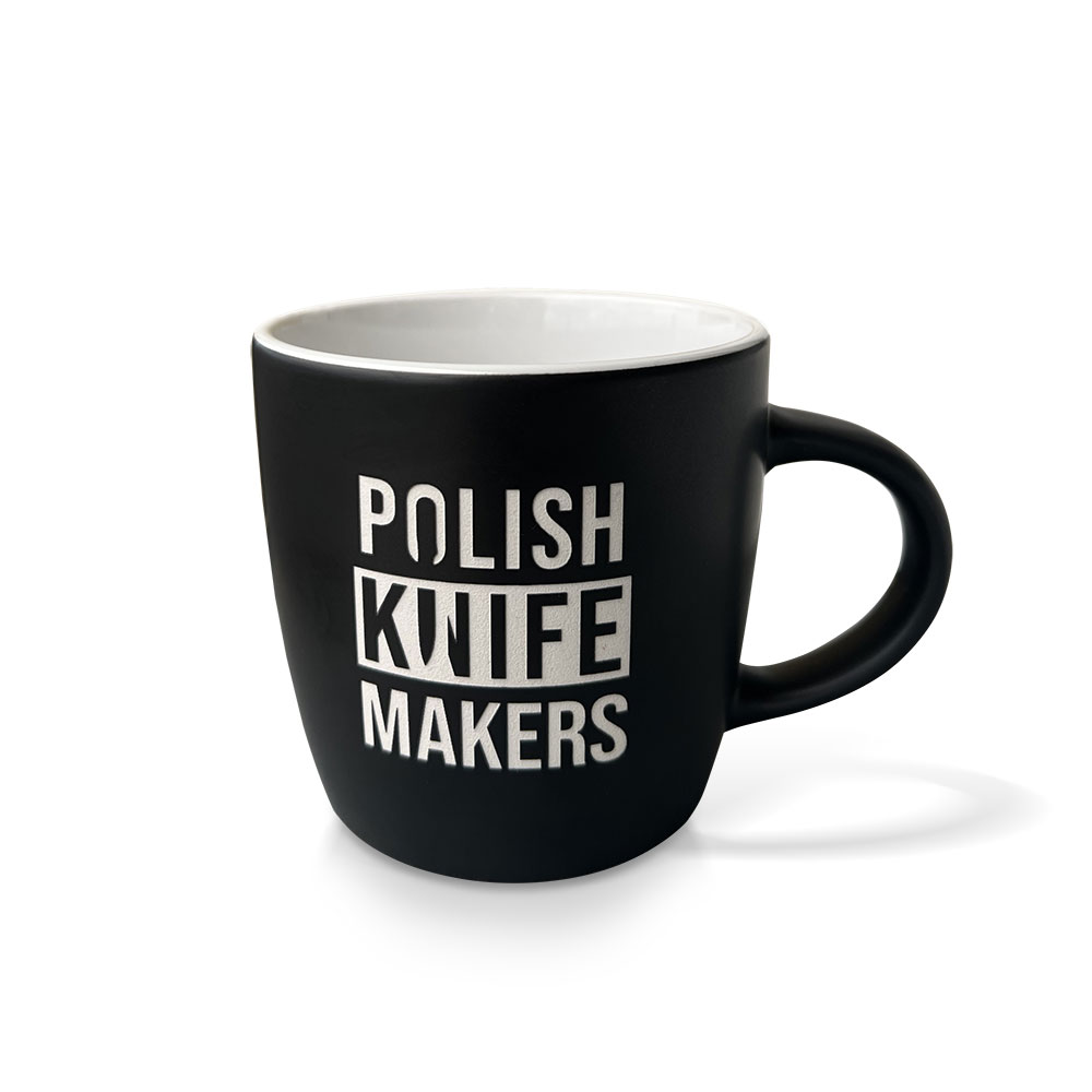 Kubek Polish Knifeamkers 350 ml to eleganckie naczynie użytku domowego. Grafika na ścianie kubka to hołd dla ogromnej społeczności utalentowanych rzemieślników z Polski i fanów ich twórczości. Doskonały na użytek domowy, do pracy, czy do biura.