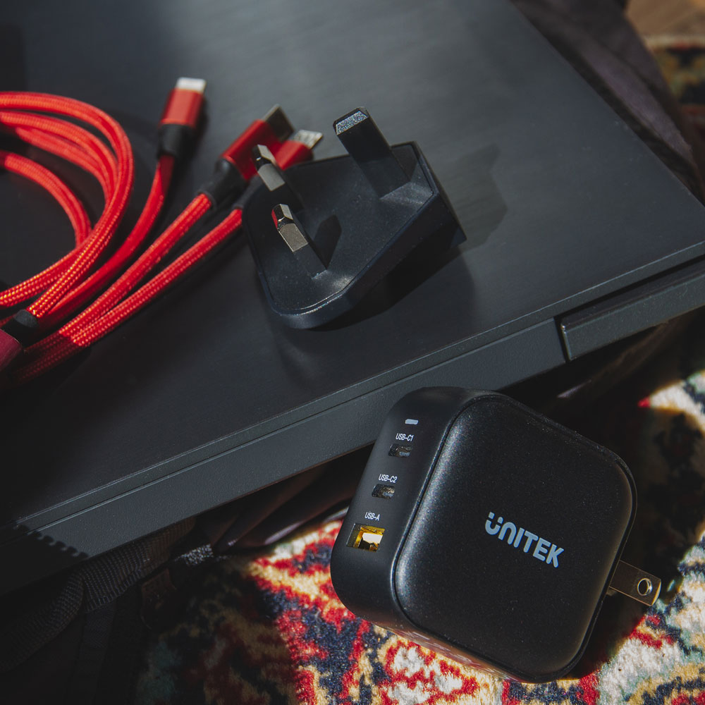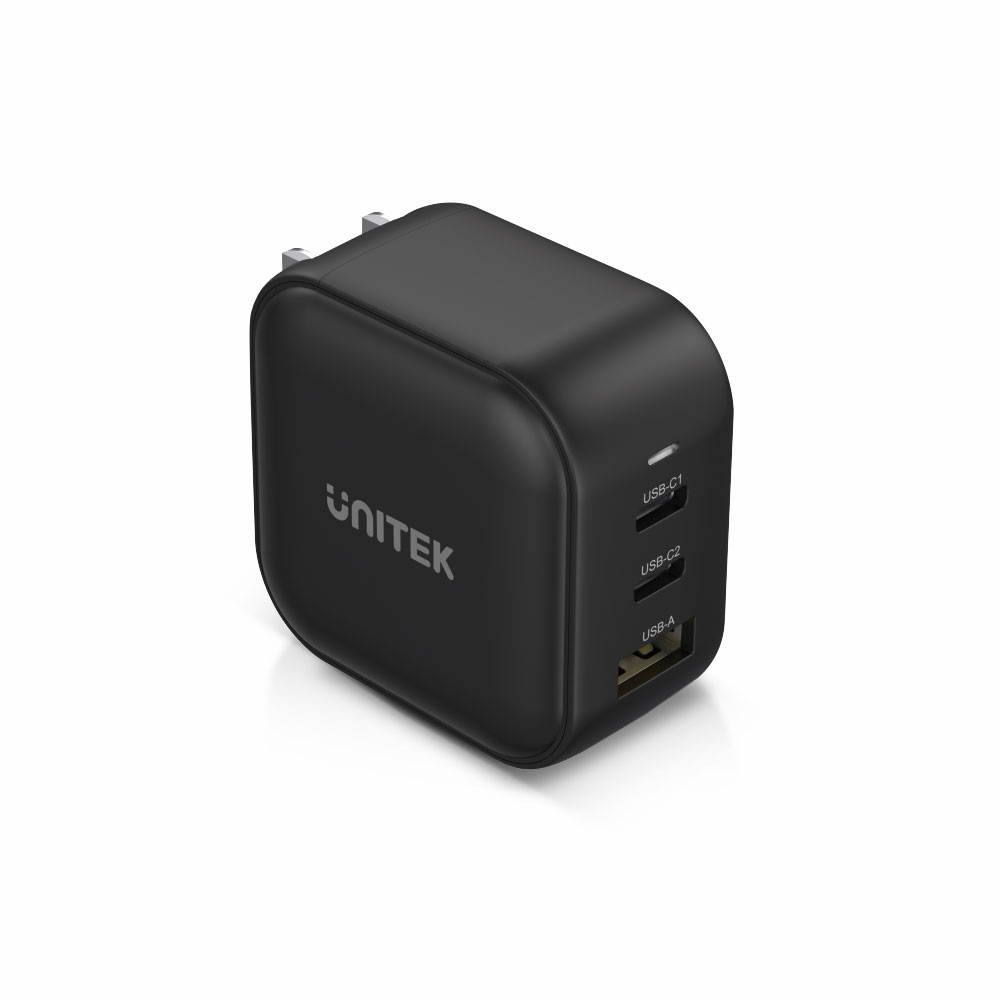 Ładowarka Unitek GaN 3 porty PD 66W QC 3.0 Czarna może ładować trzy urządzenia jednocześnie a jej moc maksymalna to 66 W.