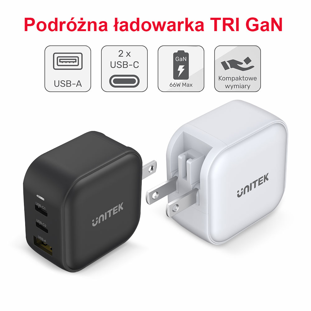 Ładowarka Unitek GaN 3 porty PD 66W QC 3.0 Czarna