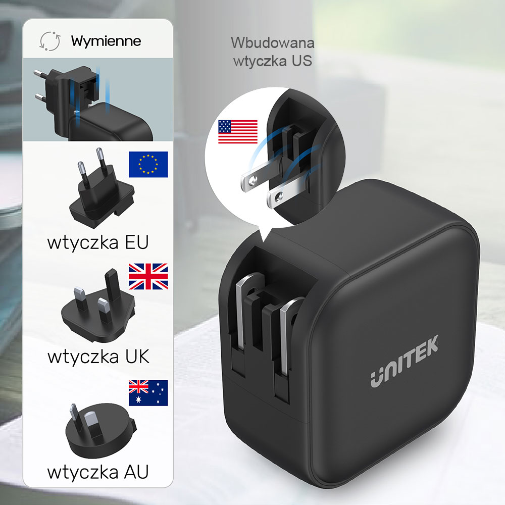 Ładowarka Unitek GaN 3 porty PD 66W QC 3.0 Czarna to uniwersalna i kompaktowa ładowarka podróżna. W zestawie posiada wtyczki: Amerykańską, Europejską, Brytyjską i Australijską. Porty wyjściowe to 2 x USB-C i 1 x USB-A.