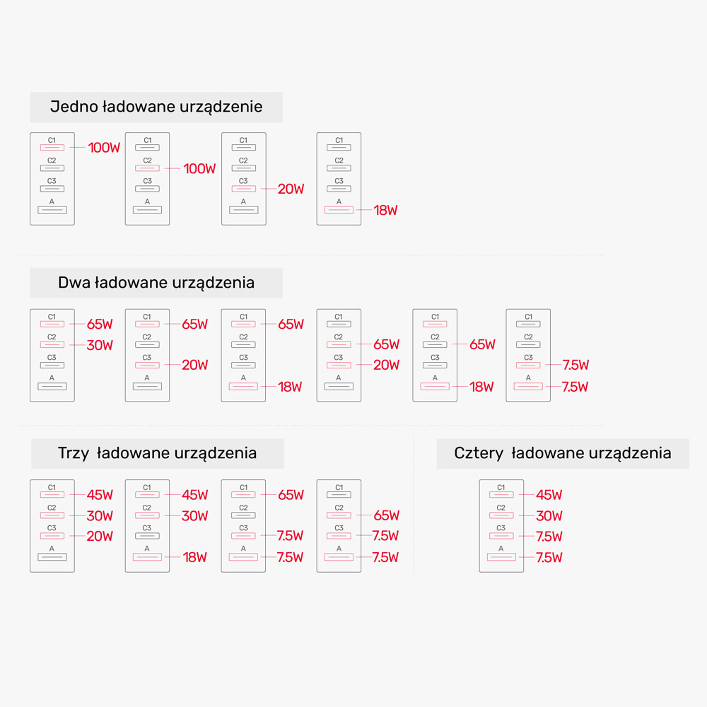 Ładowarka Unitek GaN 4 porty PD 100W QC 3.0 Biała umożliwia jednoczesne ładowanie na wszystkich czterech portach. Porty USB-C 1. i 2. obsługują do 100 W, a 3. port do 20 W. Port USB-A obsługuje standard Quick Charge 3.0 do 18 W i jest kompatybilny wstecz. Po podłączeniu urządzeń do wszystkich trzech portów USB-C maksymalna moc wyjściowa na pierwszym porcie to 45W, drugim – 30 W, a trzecim – 20 W. Ładowanie przez jeden port USB-C i jeden USB-A daje maksymalnie 65W na tym pierwszym i 18W na drugim. Podczas ładowania czterech urządzeń naraz, pierwszy port USB typu C oferuje maksymalnie 45 W, drugi port USB-C – 30 W, a trzeci port USB-C i USB-A – po 7,5 W. Całkowita moc wyjściowa ładowarki to 100 W, osiągalna przy ładowaniu jednego urządzenia z portów USB-C 1 lub USB-C 2.