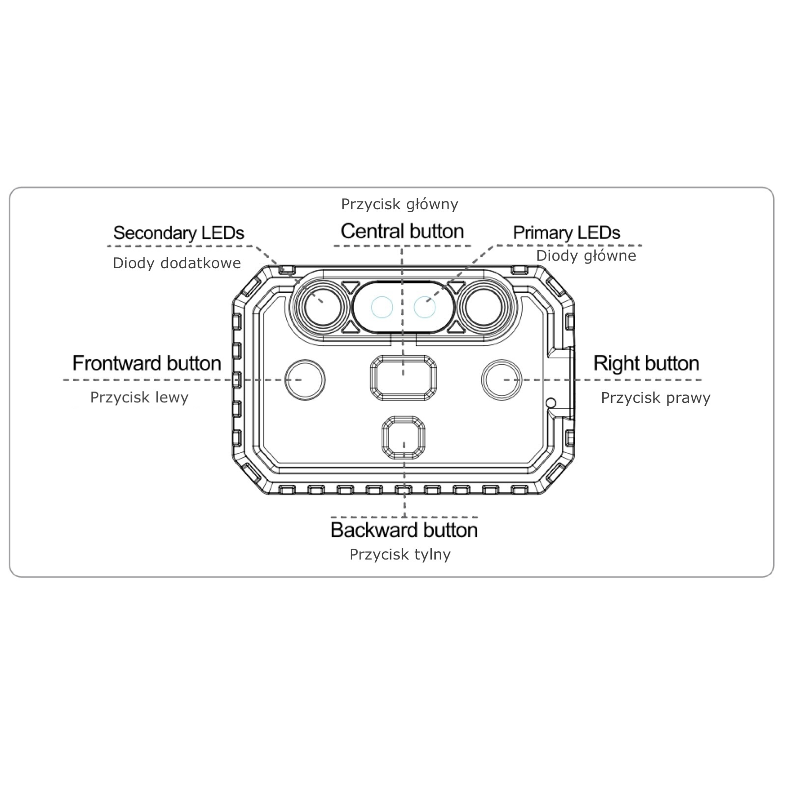 - a) Włączanie GŁÓWNYCH DIOD LED: kliknij PRZYCISK GŁÓWNY (Central button) w celu włączenia z Trybu Niskiego (Low) i następnie w celu zmiany trybu klikaj przechodząc po kolejnych trybach: Niskim (Low) – Średnim (Med/Medium) – Wysokim (High). W celu wyłączenia kliknij przycisk i trzymaj 0,5 s.