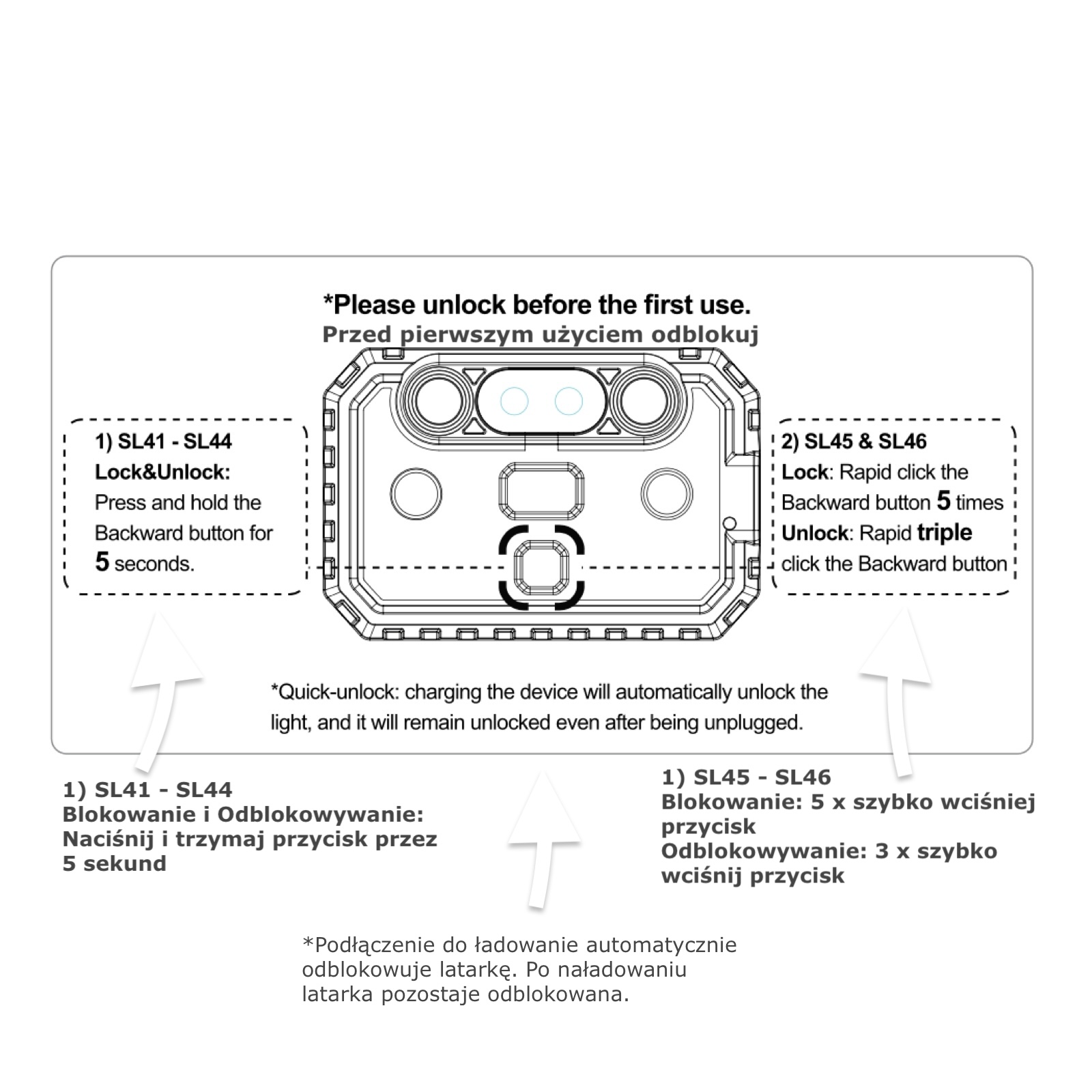 - Odblokowywanie/Blokowanie dla SL41, SL42, SL43, SL44: naciśnij i trzymaj PRZYCISK TYLNY (Backward button) przez 5 sekund.
