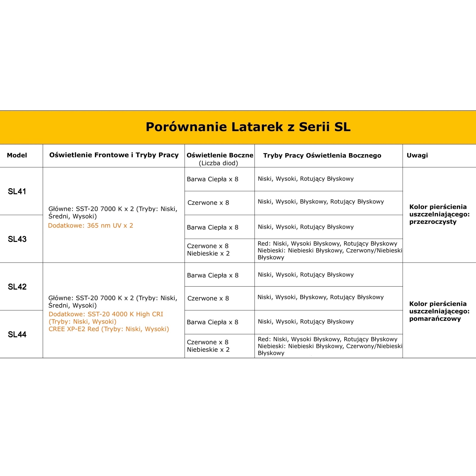 - oraz światło UV (dwie diody LED UV 365 nm) w przypadku latarek SL41 i SL43, które mogą zaspokoić różne specjalne potrzeby oświetleniowe.