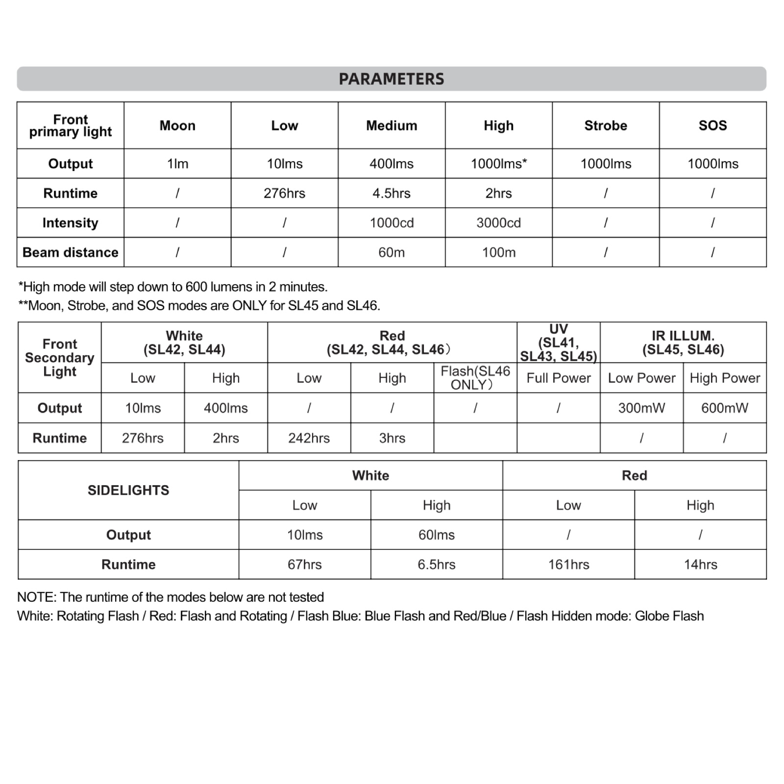 - dają światło wyposażone w wysoki współczynnik oddawania barw (4000 K High CRI) i światło czerwone w przypadku latarek SL42 i SL44