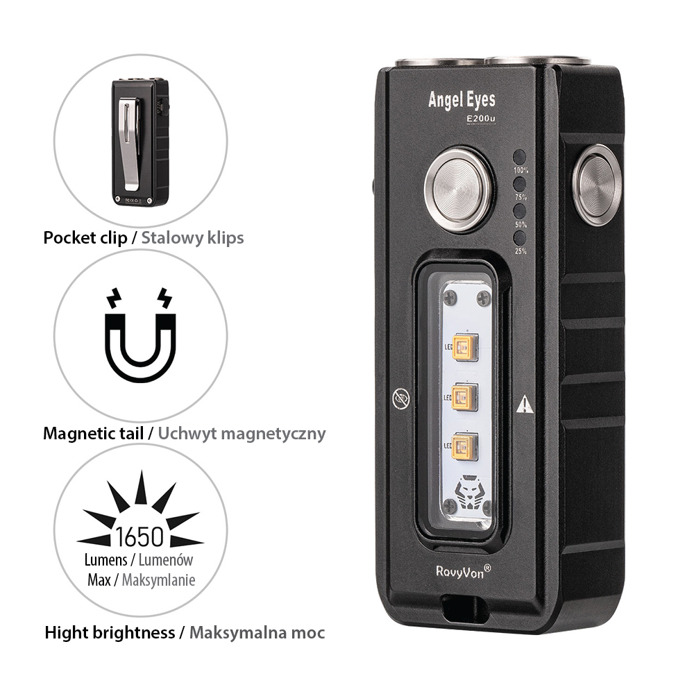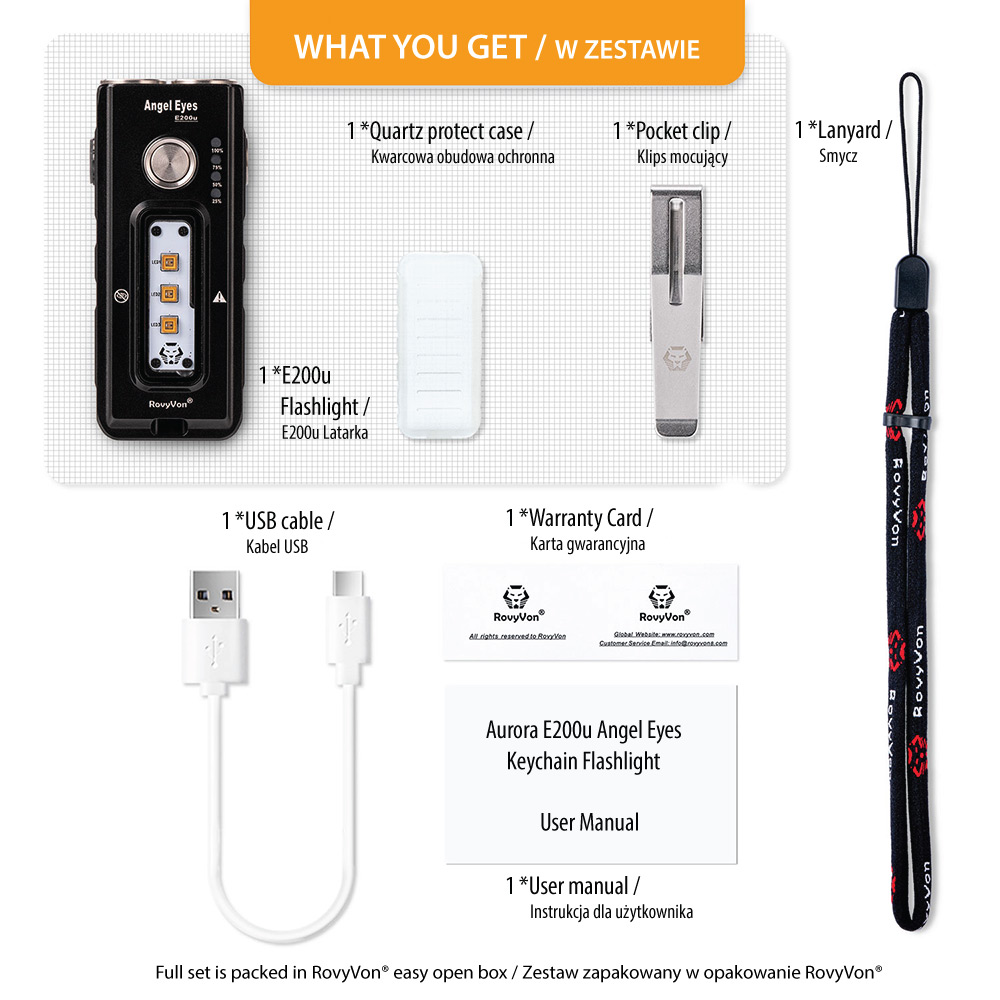 - ZESTAW: Latarka Angel Eyes E200u, smycz RovyVon, stalowy klips mocujący, kabel USB, karta gwarancyjna, instrukcja dla użytkownika, opakowanie