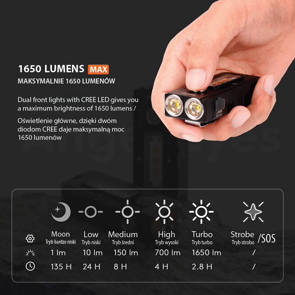 - MAKSYMALNA MOC: Ośw. główne: 1650 lumenów, ośw. boczne: 1000 lumenów