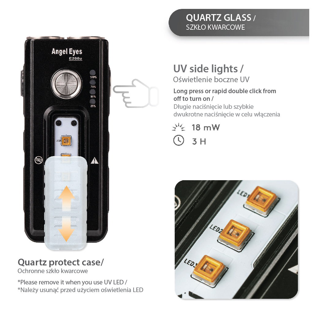 Prezentowany model Angel Eyes E200u wykonany z wytrzymałego aluminium posiada wydajne oświetlenie główne na bazie diod CREE XP-G3. Maksymalna moc światła jaką daje E200u to 1650 lumenów, a ładowany za pomocą złącza USB-C akumulator, zapewnia czas pracy o długości 1440 mAh (maksymalnie 140 godzin świecenia). Angel Eyes E200u posiada oświetlenie boczne emitujące promienie UV-C wykorzystywane przy sterylizacji i UV-A służące do sprawdzania autentyczności banknotów, znajdowania ukrytych plam itd.