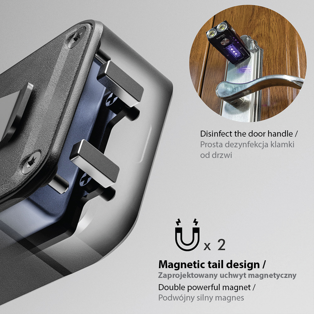 Latarka została wyposażona w otwór (uchwyt) na smycz lub paracord (smycz znajduje się w zestawie), ułatwiające przenoszenie lub zabezpieczenie przed zgubieniem. Producent wyposażył ją w system umożliwiający założenie wygodnego stalowego klipsa (klips znajduje się w zestawie), służącego do montowania w wybranym miejscu (w kieszeni, na plecaku, elementach systemu MOLLE® itd.). Dodatkowo podkreślając wielozadaniowość i roboczy charakter latarki zaprojektował otwór na statyw, pozwalający również na podłączenie jej do aparatu jako wsparcie dla fotografującego. Obudowa latarki mieści silny uchwyt magnetyczny, który umożliwia jej przyczepienie do dowolnego metalowego elementu, w miejscu wykonywanej czynności. Jest to bardzo wygodna opcja pozwalająca na skierowanie strumienia świetlnego w pożądanym kierunku i używanie obydwu rąk podczas pracy.