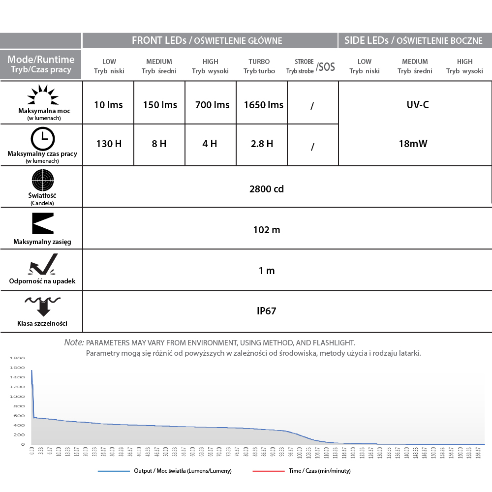 W przypadku oświetlenia głównego użytkownik ma do dyspozycji 7 trybów pracy latarki: 4 tryby światła stałego: niski, średni, wysoki, turbo, tryb błyskowy – strobo, tryb SOS oraz tryb rampowy (ustawianie wiązki światła o dowolnej mocy). Tryb błyskowy – strobo może pełnić funkcję sygnalizacyjną do oznaczania swojej pozycji, funkcję obronną przed potencjalnym napastnikiem, czy agresywnym zwierzęciem. Tryb SOS – w razie potrzeby pomoże wezwać pomoc. Tryb rampowy natomiast, pozwoli nam dobrać moc wiązki światła do indywidualnych potrzeb.