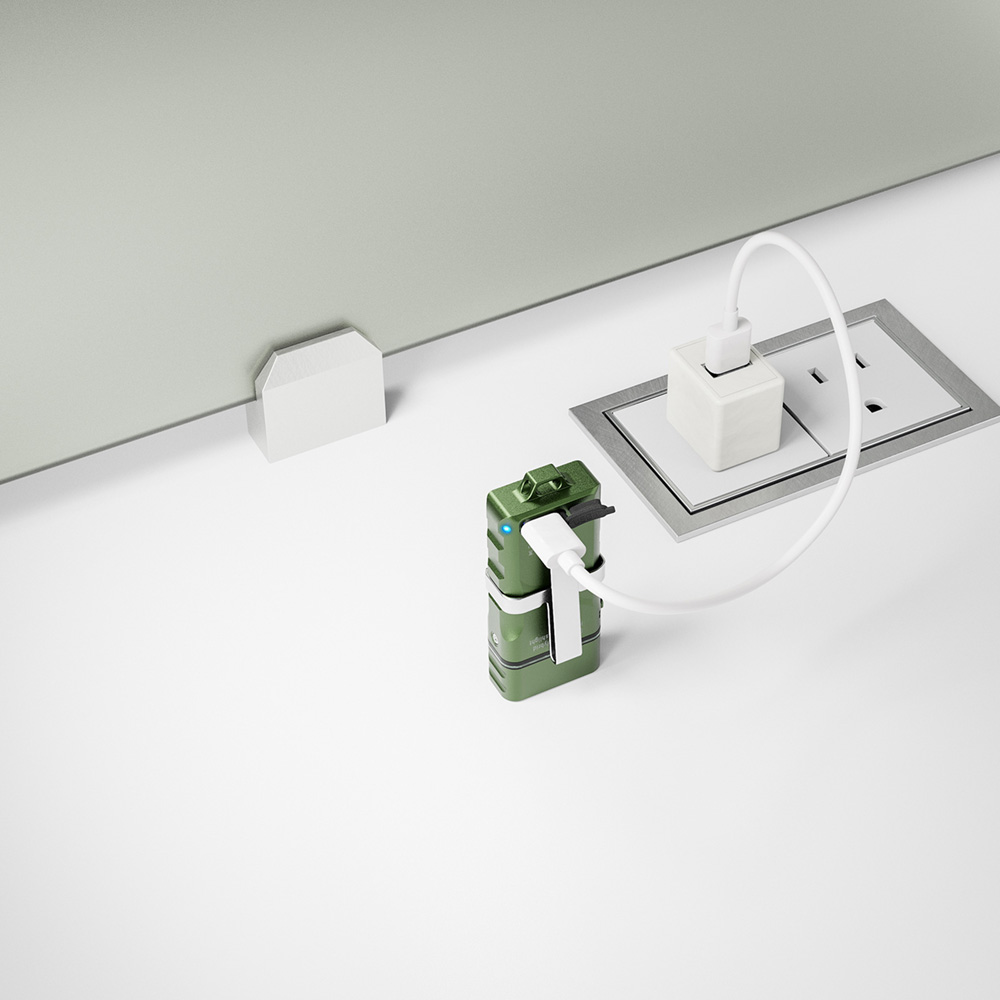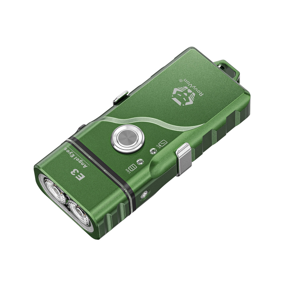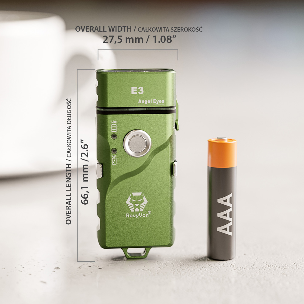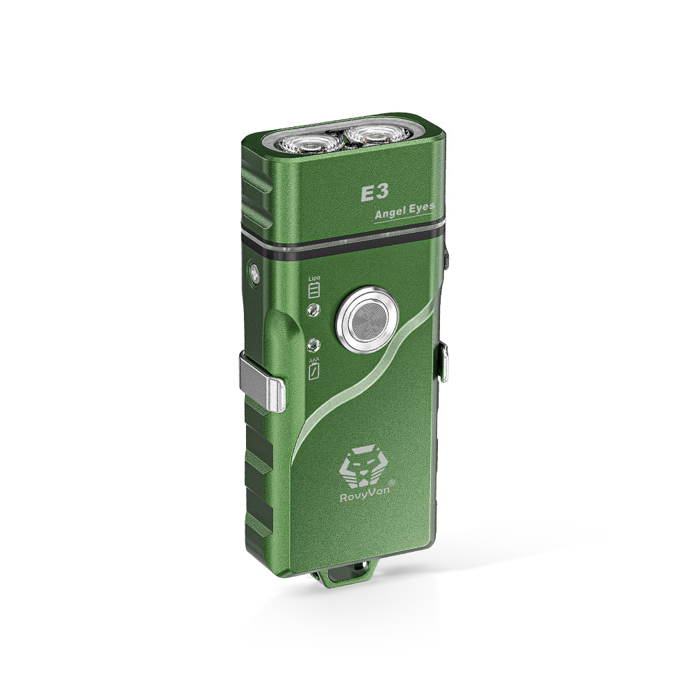 Latarka Angel Eyes E3 wyposażona jest we wbudowany litowo-polimerowy (LIPO) akumulator o pojemności 300 mAh, który można ładować przez port ładowania USB-C. Latarka posiada alternatywną opcję zasilania w postaci miejsca na typową baterię AAA (bateria alkaliczna 1,5 V lub akumulator NiMH 1,2 V) lub akumulator litowo-jonowy 10440 o tym samym rozmiarze (akcesoria nie załączone w pakiecie startowym). Po włożeniu zewnętrznej baterii (AAA lub 10440), latarka po włączeniu domyślnie użyje zewnętrznej baterii. Oczywiście istnieje opcja wyboru preferowanego w danym momencie źródła zasilania. O tym, które źródło w danej chwili zasila urządzenie informuje widoczna na boku latarki dioda. Kolor zielony na urządzeniu sygnalizuje zasilanie z baterii zewnętrznej, a kolor niebieski z wbudowanego akumulatora.