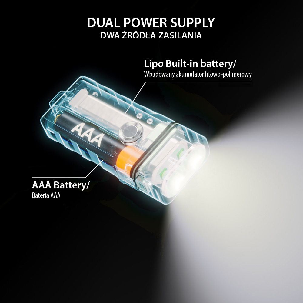 Latarka Angel Eyes E3 wyposażona jest we wbudowany litowo-polimerowy (LIPO) akumulator o pojemności 300 mAh, który można ładować przez port ładowania USB-C. Latarka posiada alternatywną opcję zasilania w postaci miejsca na typową baterię AAA (bateria alkaliczna 1,5 V lub akumulator NiMH 1,2 V) lub akumulator litowo-jonowy 10440 o tym samym rozmiarze (akcesoria nie załączone w pakiecie startowym). Po włożeniu zewnętrznej baterii (AAA lub 10440), latarka po włączeniu domyślnie użyje zewnętrznej baterii. Oczywiście istnieje opcja wyboru preferowanego w danym momencie źródła zasilania. O tym, które źródło w danej chwili zasila urządzenie informuje widoczna na boku latarki dioda. Kolor zielony na urządzeniu sygnalizuje zasilanie z baterii zewnętrznej, a kolor niebieski z wbudowanego akumulatora.