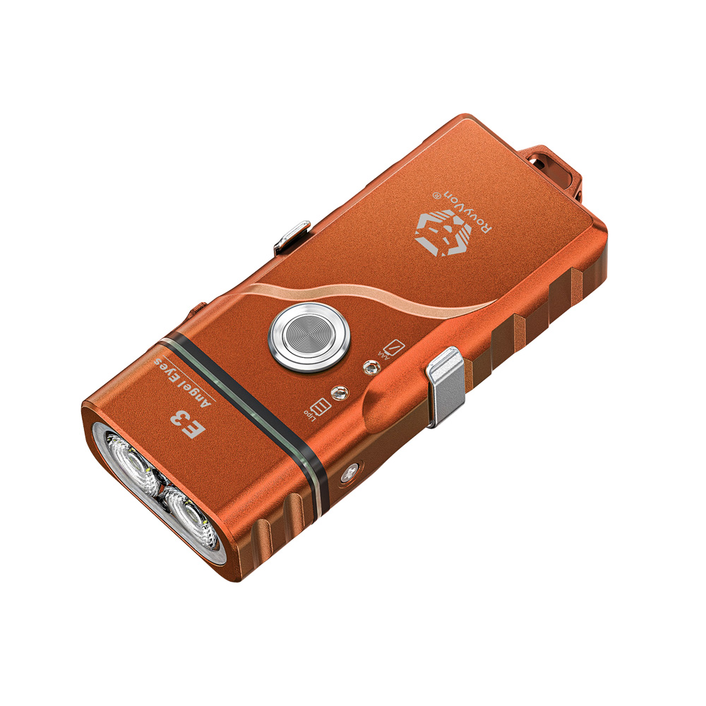 Prezentowana latarka LED RovyVon Angel Eyes E3 Orange posiada dwie diody dające maksymalne oświetlenie o mocy aż 700 lumenów oraz korpus z aluminium 6063 w kolorze pomarańczowym. Wbudowany akumulator litowo-polimerowy zapewnia maksymalnie 54 godziny czasu pracy.