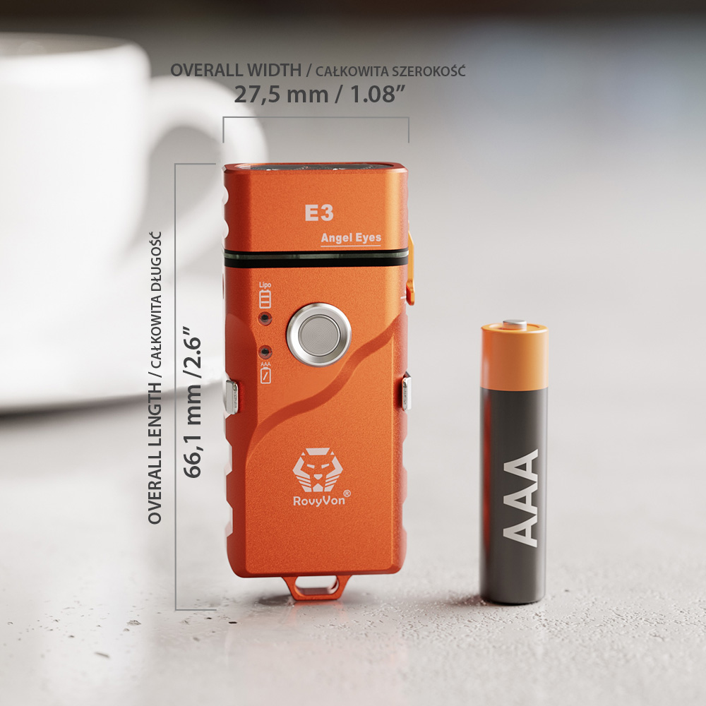 Latarka LED RovyVon Angel Eyes E3 Orange Hybrydowa Akumulator i Bateria AAA 700 Lumenów to małe użyteczne źródło światła w formie breloka do kluczy.