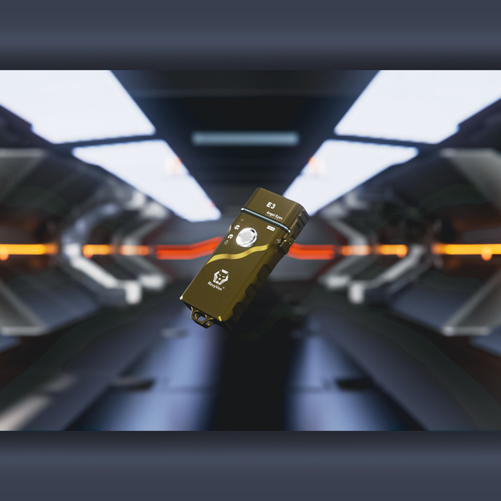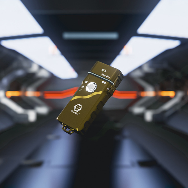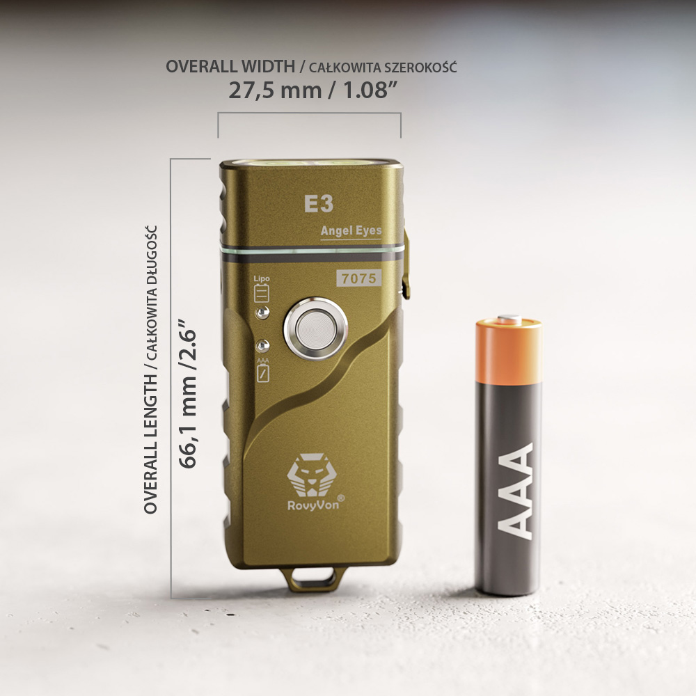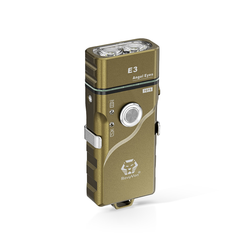 Latarka LED RovyVon Angel Eyes E3 Pro Desert Tan Hybrydowa Akumulator i Bateria AAA 700 Lumenów to małe użyteczne źródło światła w formie breloka do kluczy.
