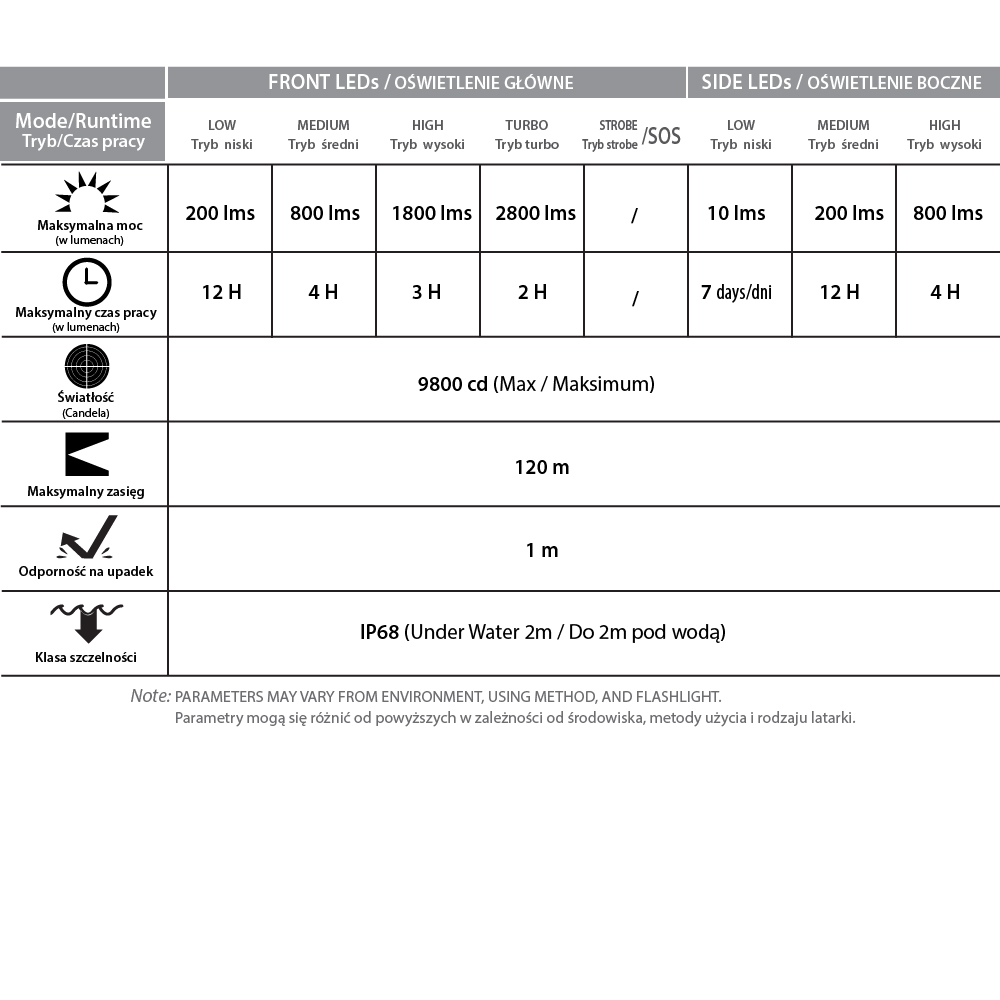 W przypadku oświetlenia głównego użytkownik ma do dyspozycji 7 trybów pracy latarki: tryb chwilowego podświetlenia (turbo), 4 tryby światła stałego: niski, średni, wysoki, turbo, tryb błyskowy – strobo, tryb SOS . Tryb błyskowy – strobo może pełnić funkcję sygnalizacyjną do oznaczania swojej pozycji, funkcję obronną przed potencjalnym napastnikiem, czy agresywnym zwierzęciem. Tryb SOS – w razie potrzeby pomoże wezwać pomoc.