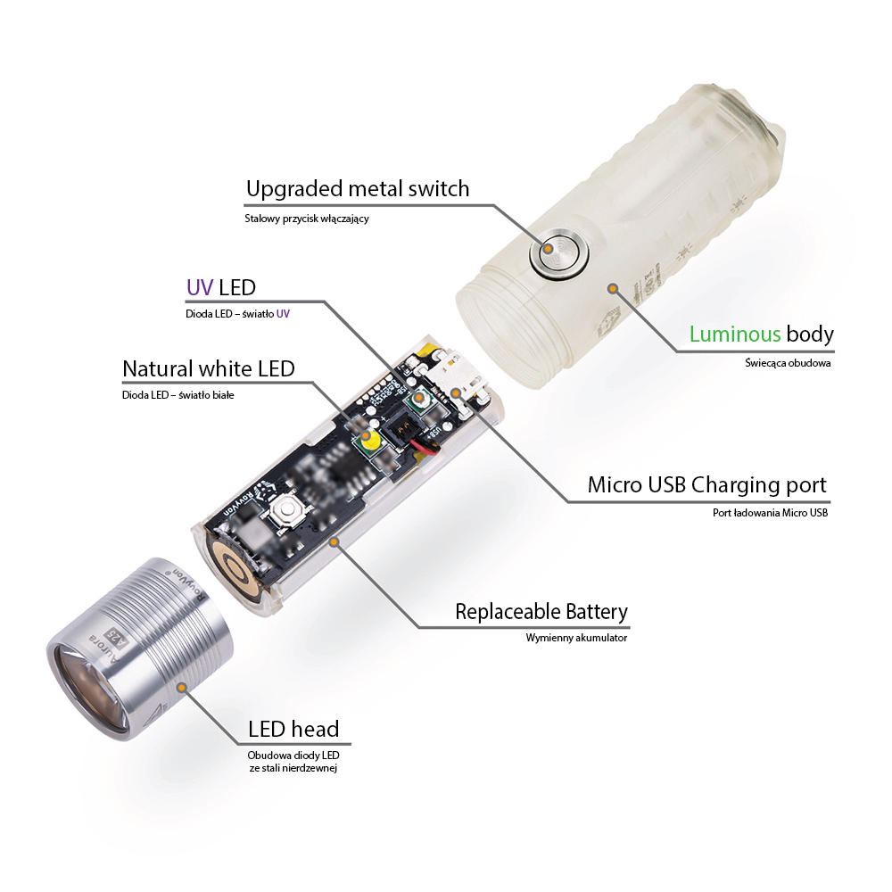 Latarka pozostaje szczelnie zamknięta (akumulator nie jest wymienialny). Przycisk włączający jest zabezpieczony silikonową nakładką, port micro USB silikonową wkładką. Dzięki temu latarka jest odporna na wilgoć i zapylenie w stopniu odpowiadającym normie IP68 (6 – całkowita odporność przed zapyleniem; 8 – ochrona przed skutkami zanurzenia w wodzie do 2 m).NAZWA: Aurora A25 GITD White/UV