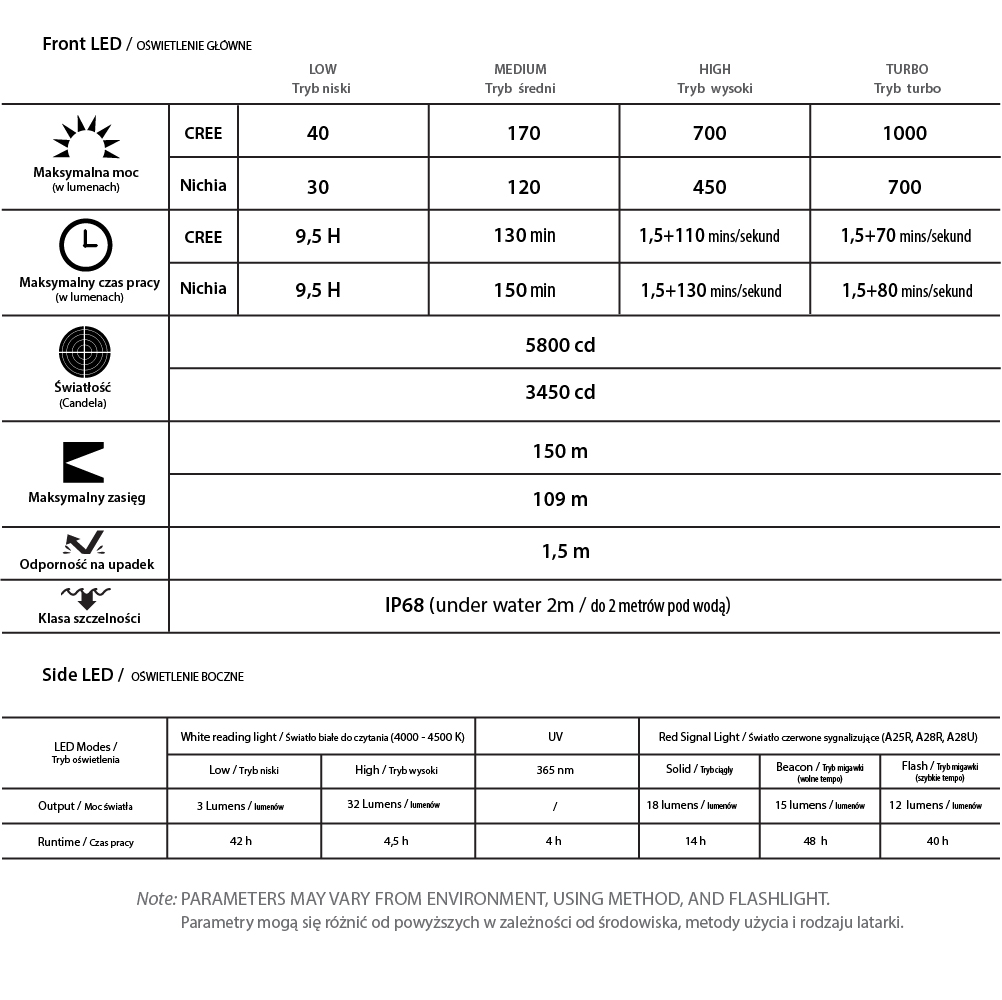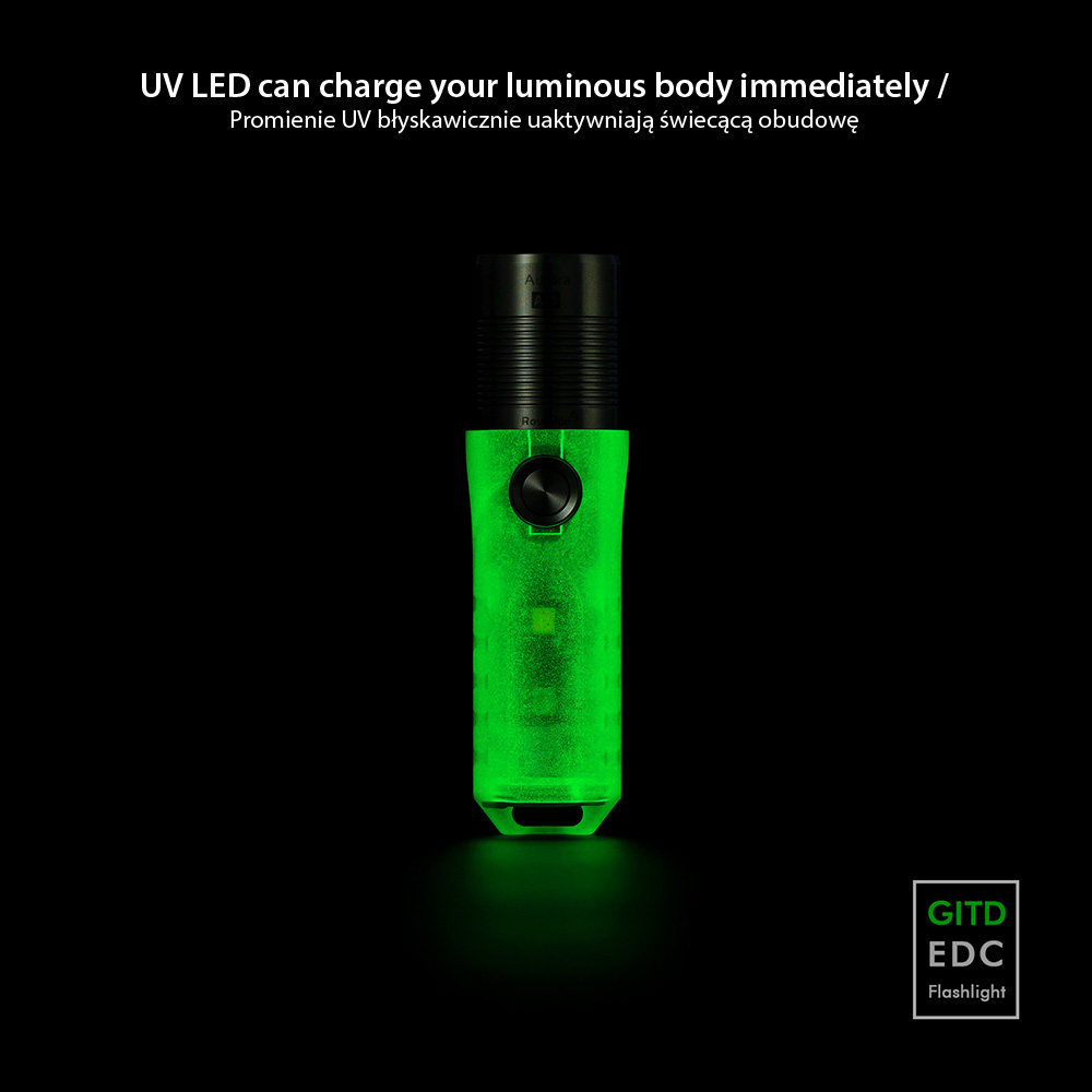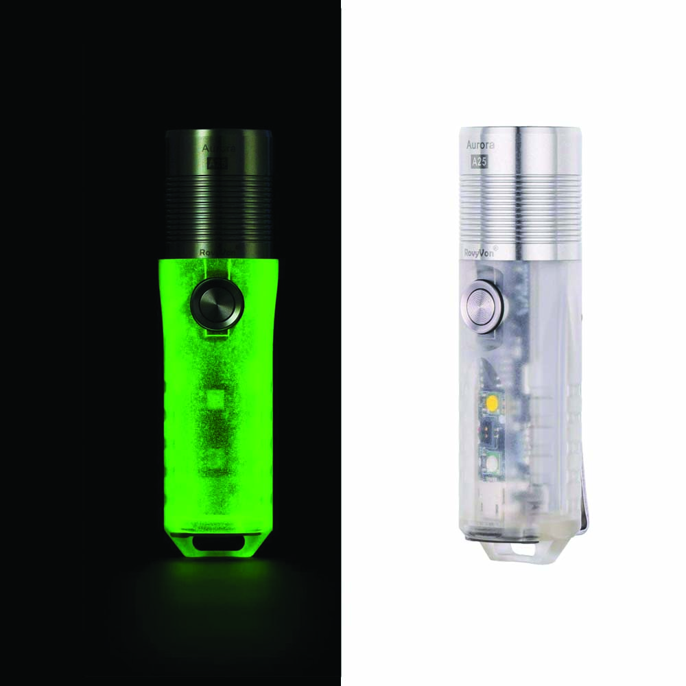 Prezentowany model Aurora A25 GITD White/UV z wytrzymałego fluorescencyjnego poliwęglanu posiada wydajną diodę LED CREE XP-L HD V6 dającą maksymalne oświetlenie o mocy aż 1000 lumenów, a ładowany za pomocą złącza micro USB akumulator zapewnia maksymalnie 72 godziny czasu pracy. Latarka posiada oświetlenie boczne, świecące w zależności od potrzeby na biało lub w trybie UV. Oświetlenie boczne uaktywnia fluorescencyjną obudowę latarki, która po wyłączeniu diod świeci na zielono (funkcja GITD – Glow In The Dark – obudowa świecąca w ciemności).