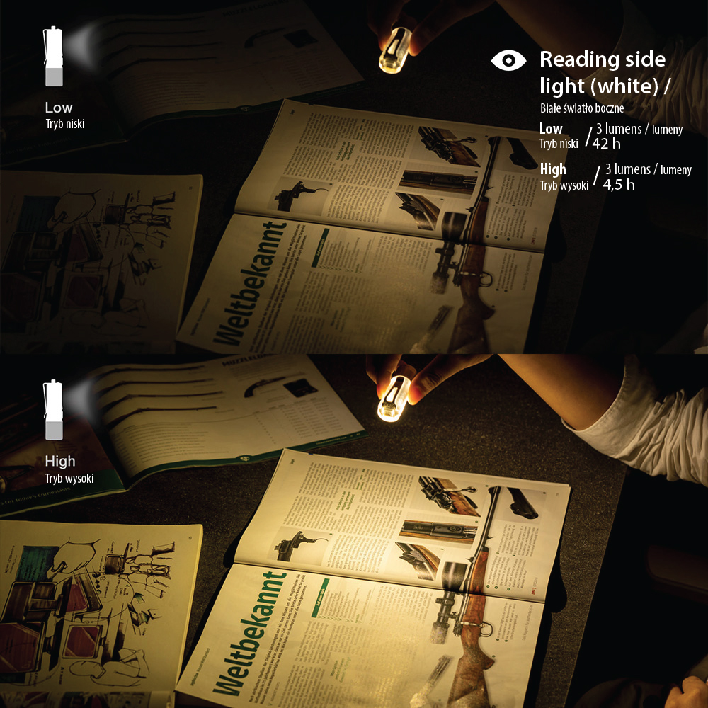 W przypadku oświetlenia bocznego użytkownik ma do dyspozycji 3 tryby pracy latarki: światło białe – tryb niski, światło białe – tryb wysoki, oraz tryb UV. Światło białe oświetlenia bocznego (kolor neutralny o barwie 4500K) przyda się z pewnością podczas obozowania, w namiocie itd. Posłuży jako wsparcie podczas prostych czynności w trakcie kempingu, umożliwi czytanie przed snem itd. Tryb UV służy głównie do naładowania świecącej na zielono obudowy (GITD – Glow In The Dark).