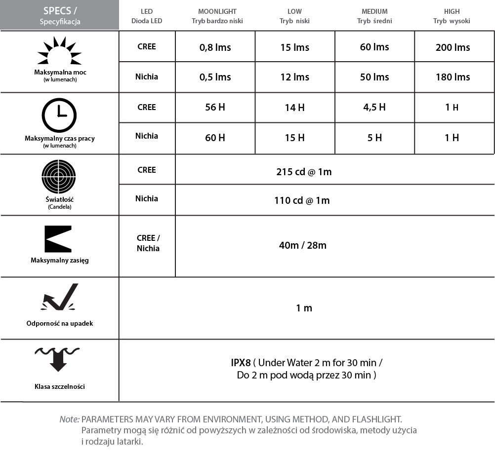 MAKSYMALNA MOC: 200 lumenówAKUMULATOR: Litowo-polimerowy
