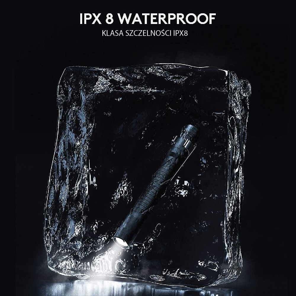 Latarka pozostaje szczelnie zamknięta (akumulator nie jest wymienialny). Przycisk włączający jest zabezpieczony silikonową nakładką, port micro USB silikonową wkładką. Dzięki temu latarka jest odporna na wilgoć i zapylenie w stopniu odpowiadającym normie IPX8 (latarka może pozostać zanurzona do 2 metrów pod wodą przez ok. 30 minut).NAZWA: Aurora A33 Dark Green