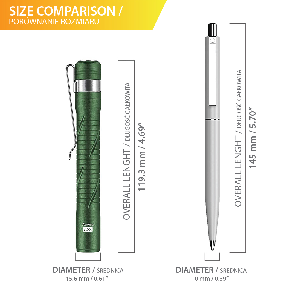 Aurora A33 dzięki klipsowi, może być przenoszona w kieszeni na klatce piersiowej, co sprawia że jest zawsze pod ręką, w pełnej gotowości do użycia. Przez wzgląd na budowę i dopasowane źródło światła rekomendowana jest do używania przez lekarzy, ratowników medycznych, mechaników, techników itd.