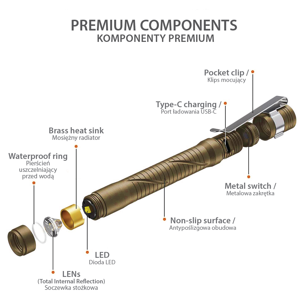 Latarka została zaprojektowana w formie długopisu. Jest bardzo poręczna, zmieści się w dłoni, w kieszeni fartucha lekarskiego, czy odzieży roboczej. Struktura zewnętrzna obudowy, celowo karbowana poprawia chwytność i ładnie się prezentuje.