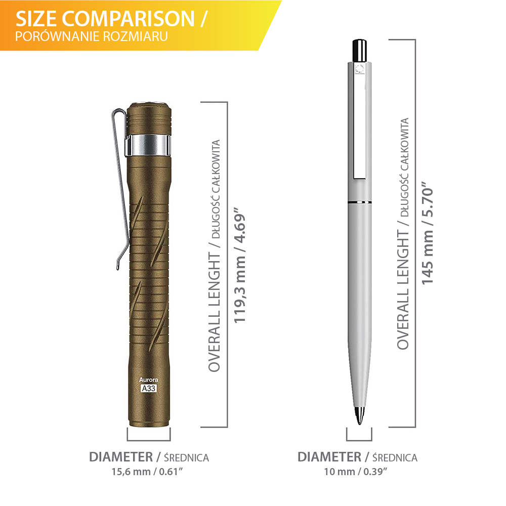Aurora A33 dzięki klipsowi, może być przenoszona w kieszeni na klatce piersiowej, co sprawia że jest zawsze pod ręką, w pełnej gotowości do użycia. Przez wzgląd na budowę i dopasowane źródło światła rekomendowana jest do używania przez lekarzy, ratowników medycznych, mechaników, techników itd.