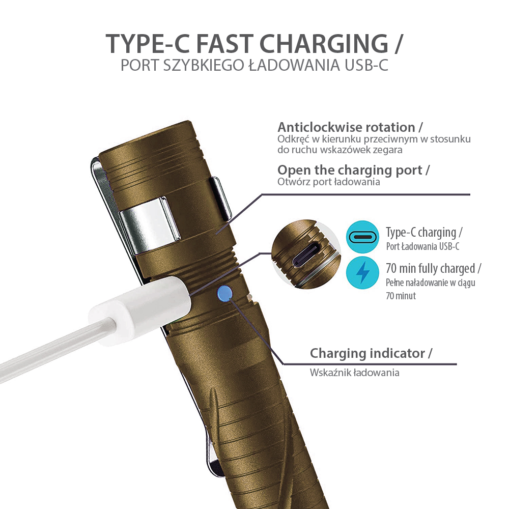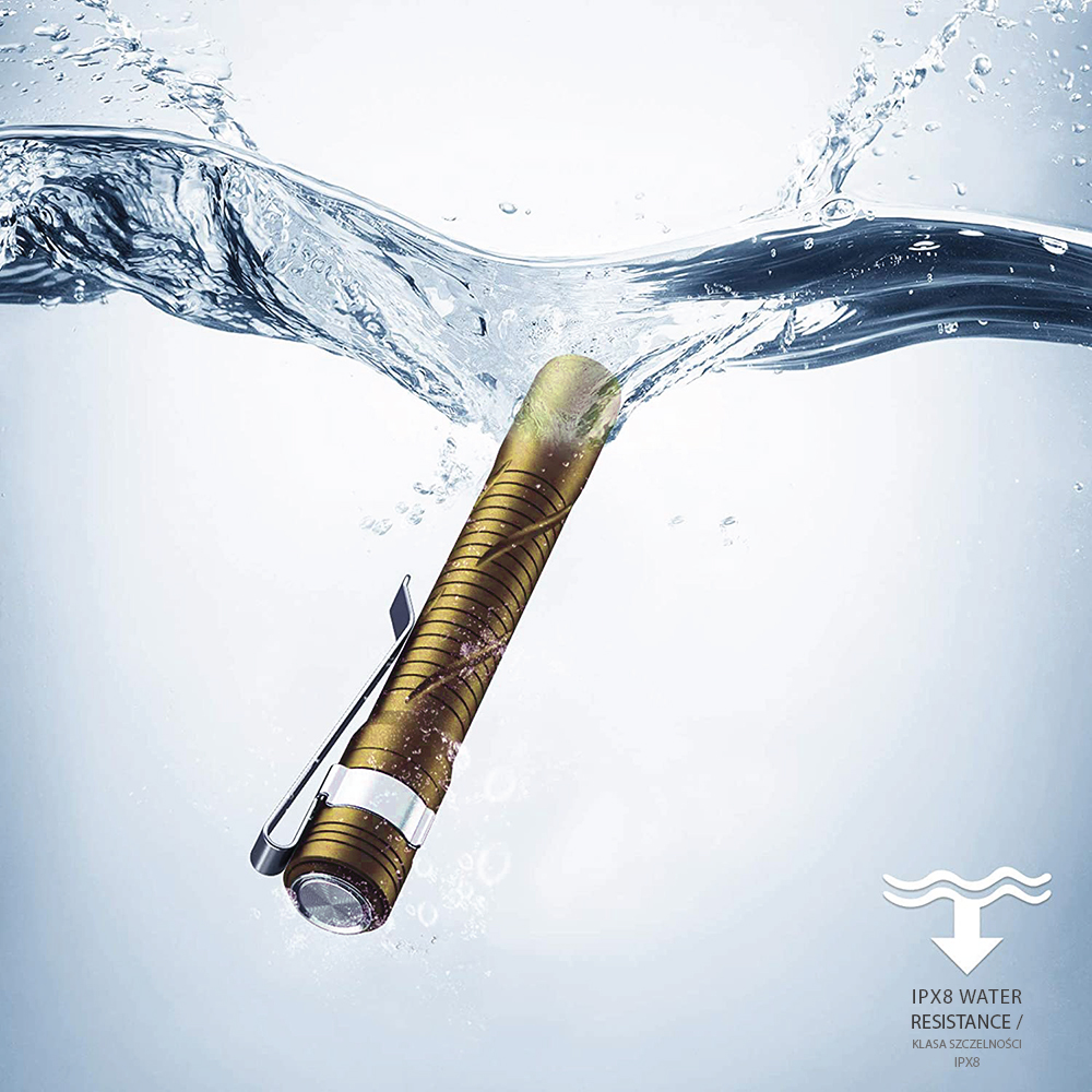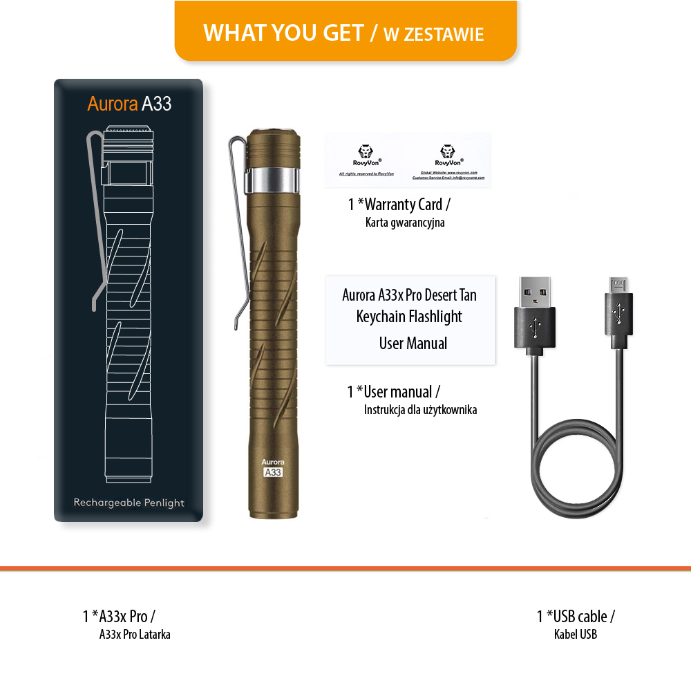 Latarka pozostaje szczelnie zamknięta (akumulator nie jest wymienialny). Przycisk włączający jest zabezpieczony silikonową nakładką, port micro USB silikonową wkładką. Dzięki temu latarka jest odporna na wilgoć i zapylenie w stopniu odpowiadającym normie IPX8 (latarka może pozostać zanurzona do 2 metrów pod wodą przez ok. 30 minut).NAZWA: Aurora A33 Desert Tan