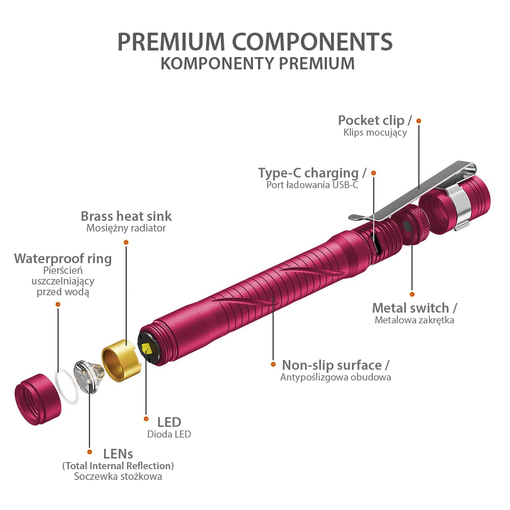 Latarka została zaprojektowana w formie długopisu. Jest bardzo poręczna, zmieści się w dłoni, w kieszeni fartucha lekarskiego, czy odzieży roboczej. Struktura zewnętrzna obudowy, celowo karbowana poprawia chwytność i ładnie się prezentuje.