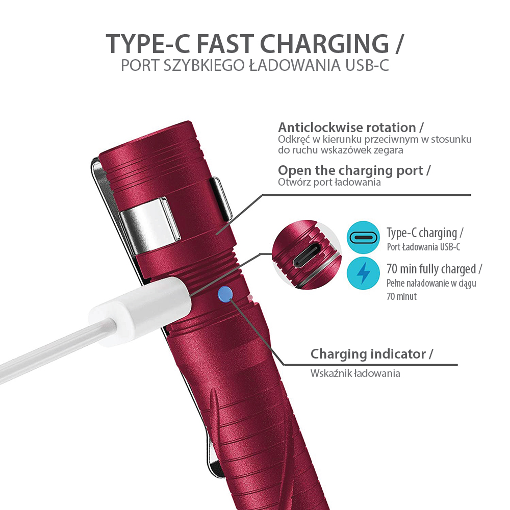 Latarka pozostaje szczelnie zamknięta (akumulator nie jest wymienialny). Przycisk włączający jest zabezpieczony silikonową nakładką, port micro USB silikonową wkładką. Dzięki temu latarka jest odporna na wilgoć i zapylenie w stopniu odpowiadającym normie IPX8 (latarka może pozostać zanurzona do 2 metrów pod wodą przez ok. 30 minut).NAZWA: Aurora A33 Red