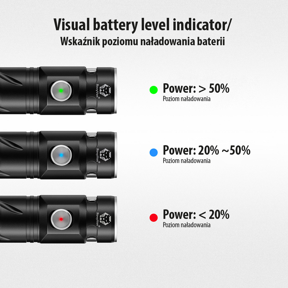 Latarka posiada wymienny akumulator litowo-jonowy akumulator 21700 (w zestawie startowym znajduje się akumulator marki SAMSUNG) ładowany za sprawą portu USB-C. W latarce można stosować zamiennie akumulatory litowo-jonowe 18650 (nie są załączone). Latarka posiada wskaźnik procesu ładowania i poziomu naładowania baterii*.
