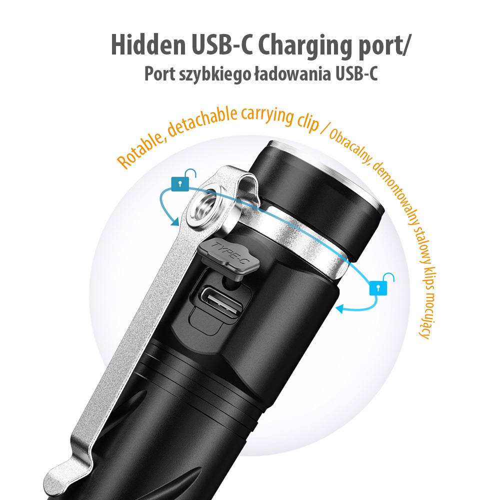Latarka wyposażona została w stalowy klips mocujący, który daje możliwość zaczepienia jej na wybranym elemencie ubioru, kieszeni, na uprzęży, na plecaku, saszetce biodrowej, na opasce na ramię, czy też w innym miejscu, tak żeby skierować strumień światła w porządnym kierunku lub ułatwić przenoszenie. W klipsie zauważalny jest gwintowany otwór umożliwiający montaż latarki na statywie (na 1/4″).