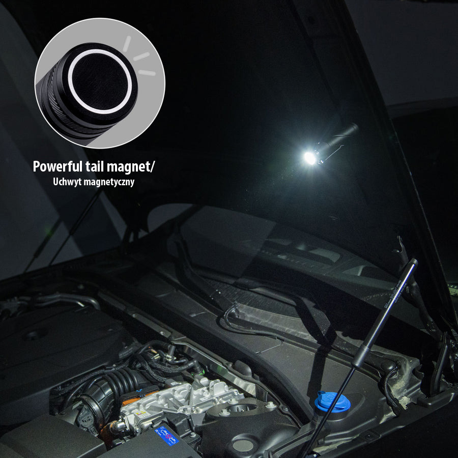 Latarka posiada uchwyt magnetyczny, który pozwala ją podczepić np. do żyrandola w przypadku awarii oświetlenie w pomieszczeniu, lub np. użyć jako latarki technicznej podczas naprawy auta.