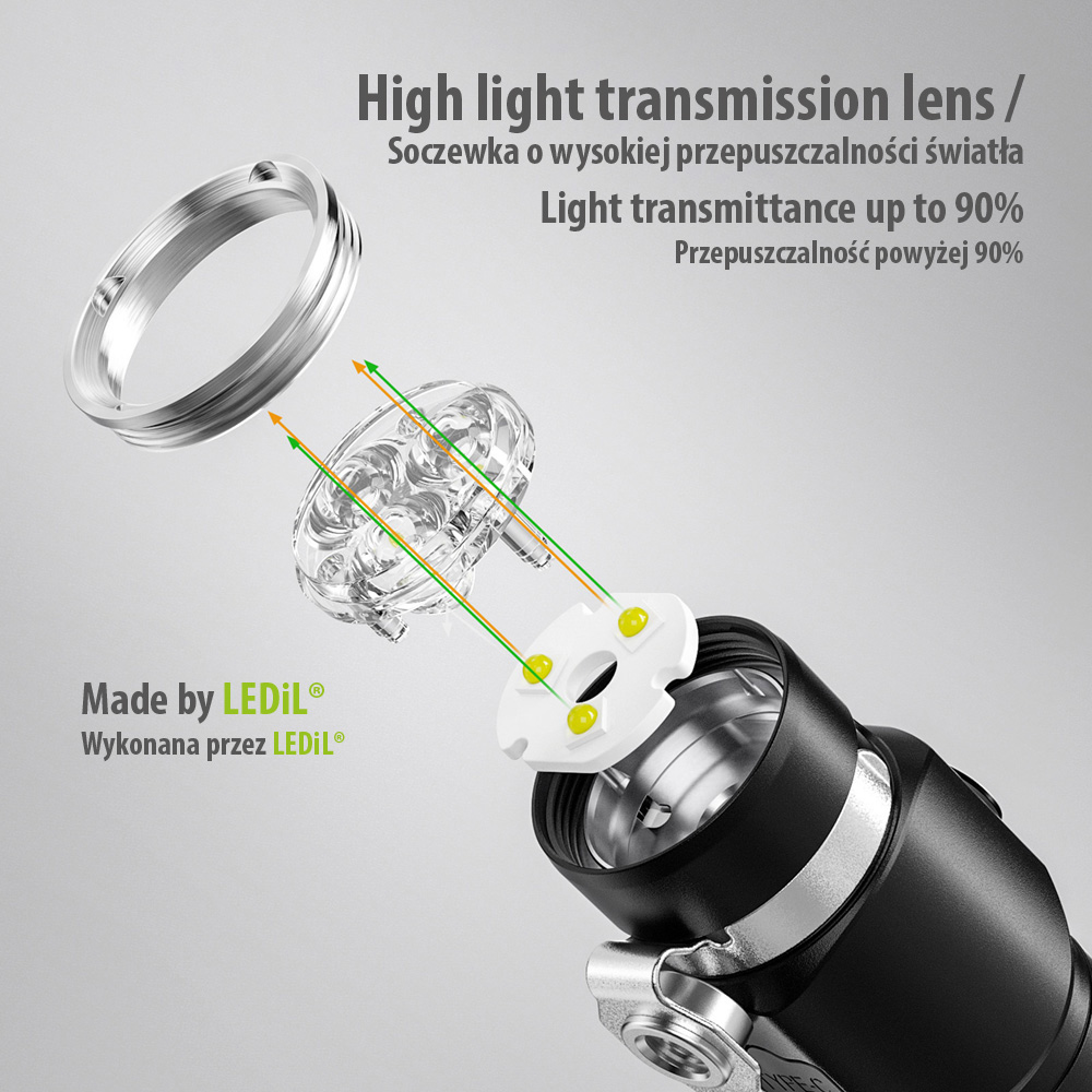 Działanie diody LED w latarce S3 wzmocnione zostało po przez zastosowanie oryginalnej soczewki optycznej LEDiL® pochodzącej z Finlandii, dzięki której latarka świeci wydajnym promieniem świetlnym.