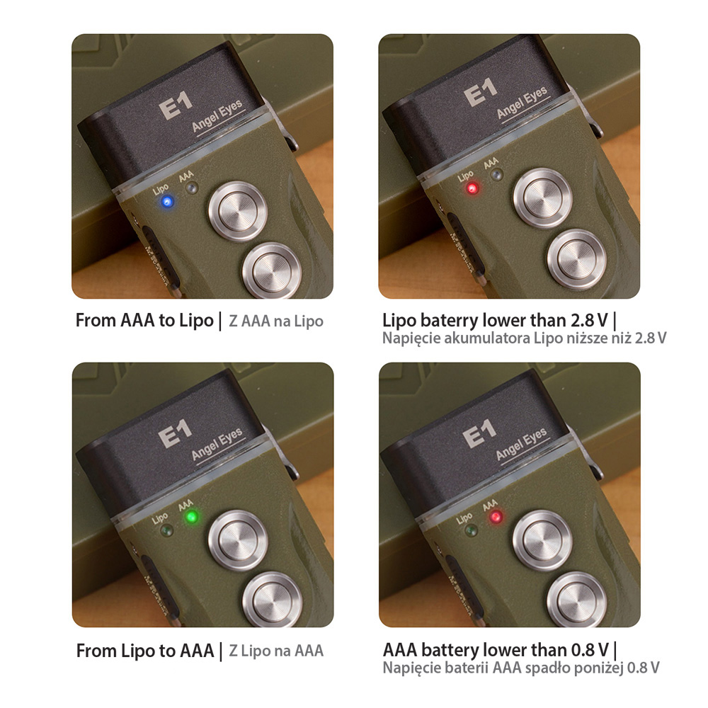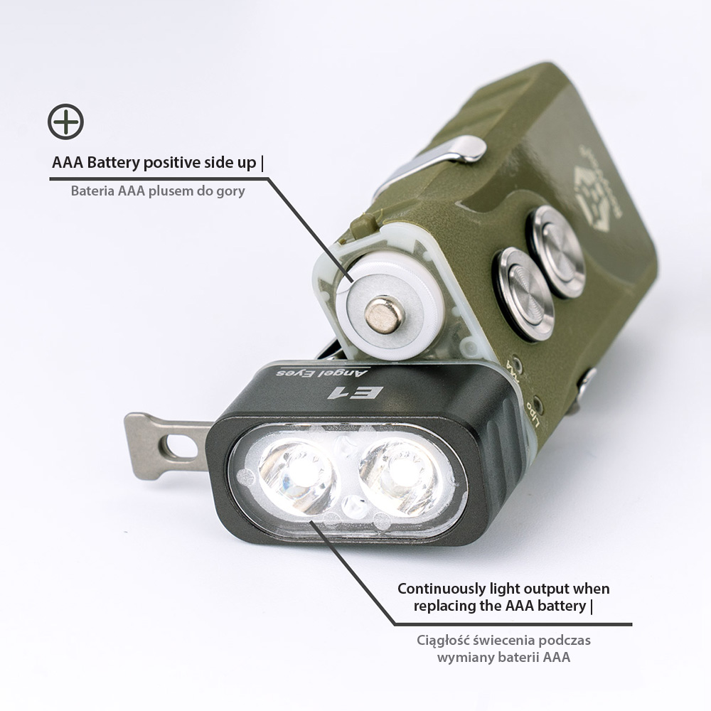 Angel Eyes E1 to latarka z linii kompaktowych, poręcznych latarek codziennego użytku (EDC – EveryDay Carry) z hybrydowym zasilaniem. Posiada dwie diody czołowe.