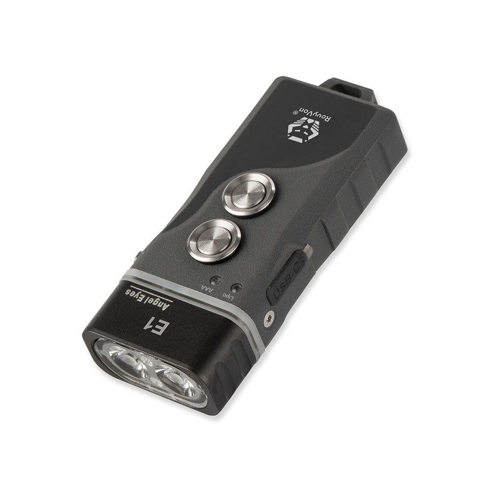 Latarka RovyVon Angel Eyes E1 Grey Hybrydowa Akumulator i Bateria AAA 700 Lumenów to kompaktowa latarka do użytku codziennego o dużej mocy.