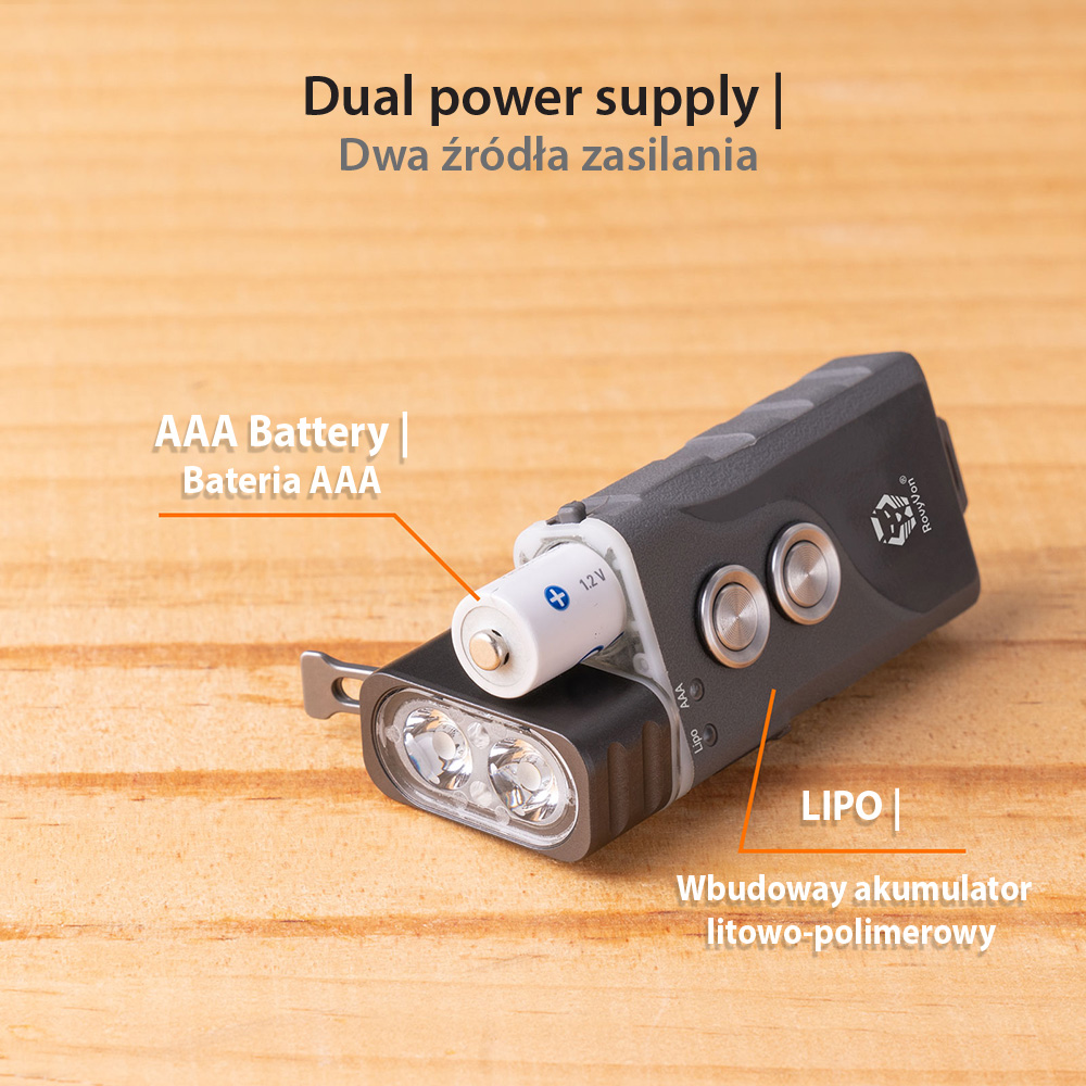 • Zasilanie: wbudowany akumulator litowo-polimerowy 300 mAh + bateria AAA (sumarycznie 108 h czasu pracy w najniższym trybie Moonlight)