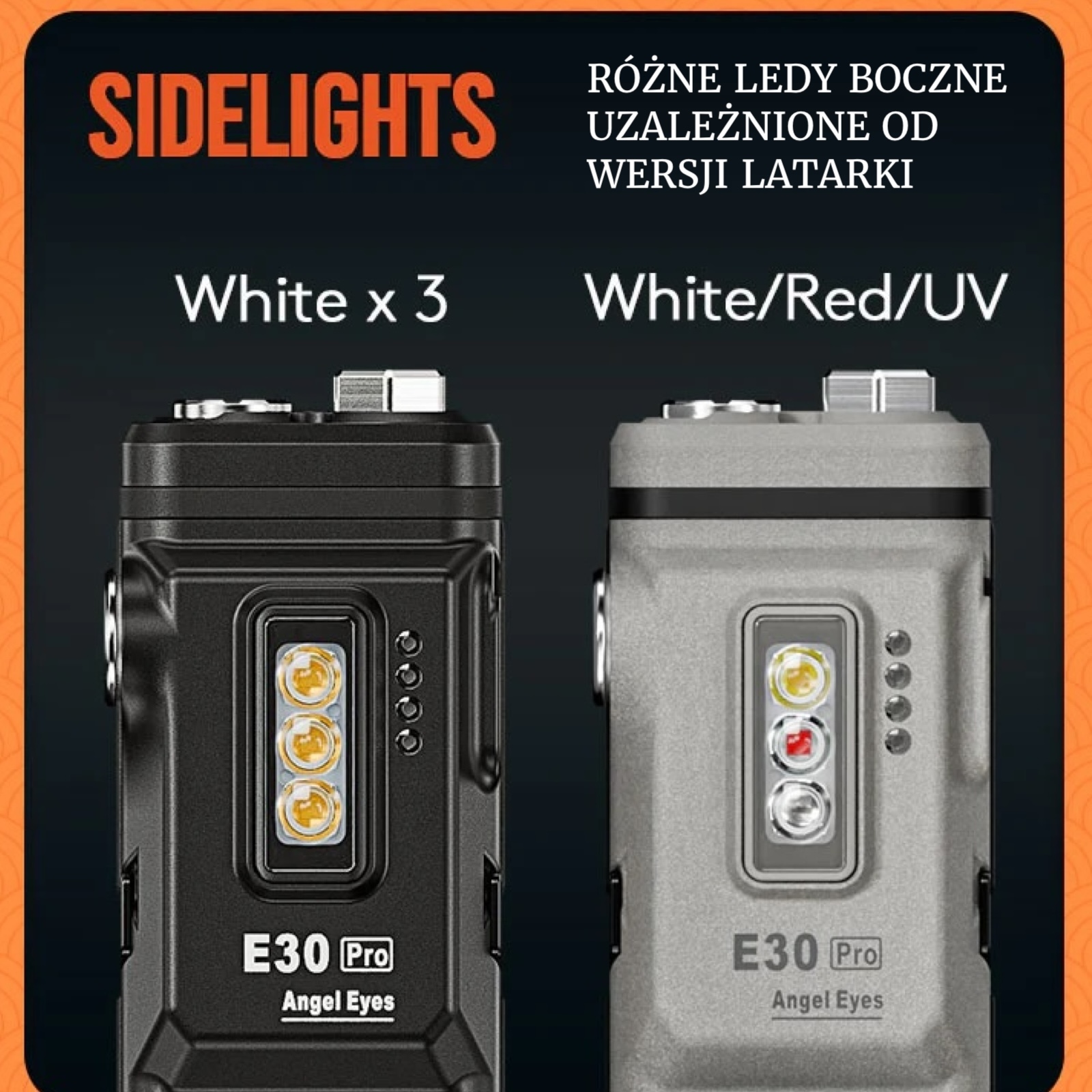 Latarka RovyVon Angel Eyes E30 Pro 7000K SST-40 & Side LEDs URW Black EDC Taktyczna Akumulator 3500 Lumenów to solidne żródło światła o maksymalnej mocy aż 3500 lumenów. E30 Pro to propozycja nie tylko dla służb mundurowych, ale również dla użytkowników ceniących w użytku codziennym, w trakcie wypraw, biwaków i wędrówek wydajną moc świetlną oraz wytrzymałość akumulatora. W porównaniu do wersji podstawowej (Latarka E30) prezentowana wersja posiada mocniejsze diody frontowe i światło boczne w postaci 3 diod specjalnych dających światło białe, czerwone i promienie UV oraz wydajniejszy akumulator.