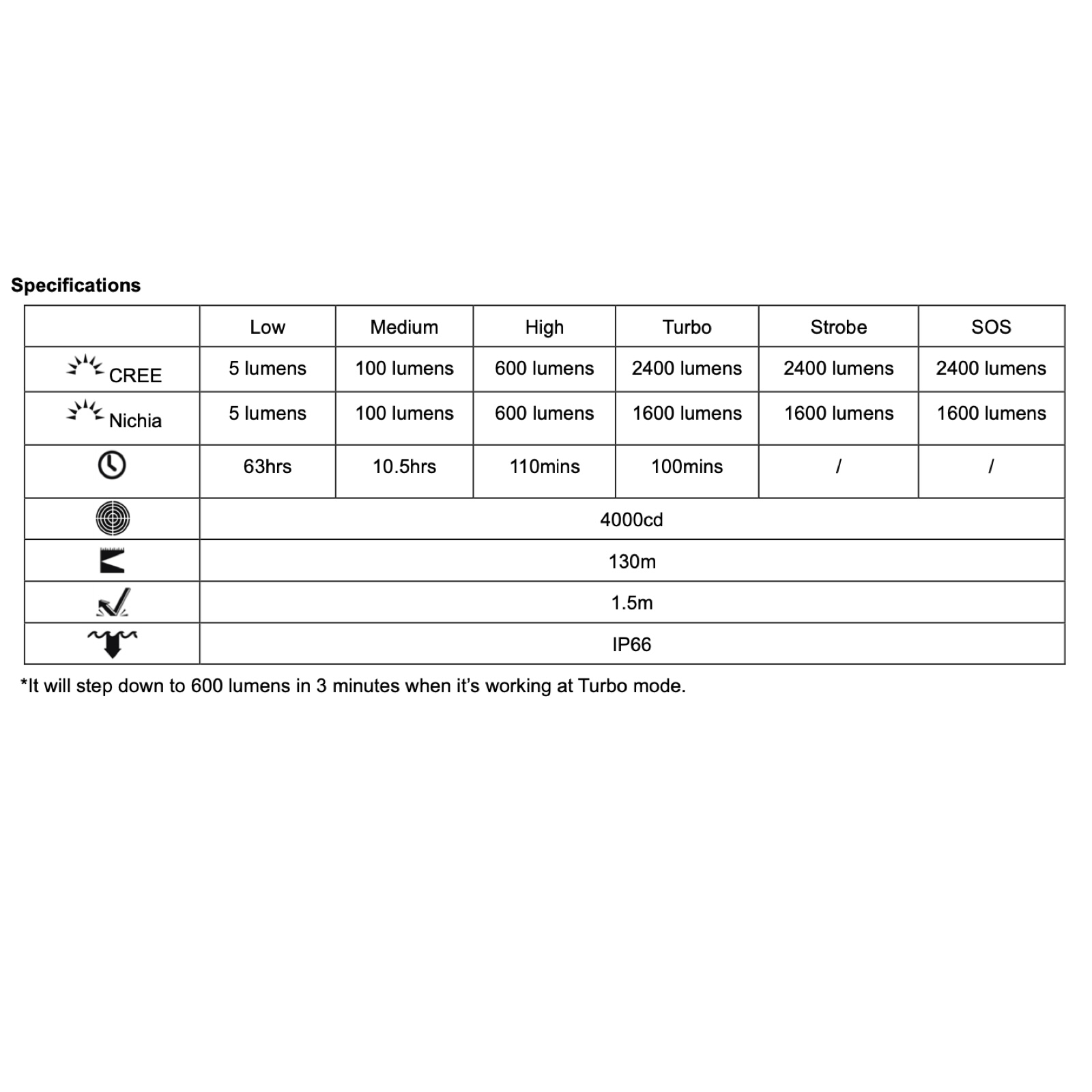 * Po 3 minutach czasu pracy w tym trybie następuje redukcja do 600 lumenów aby zapobiedz przegrzaniu się elementów latarki.